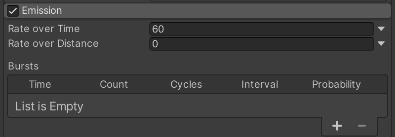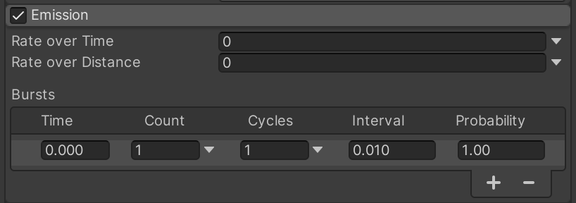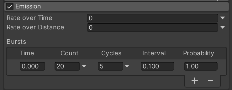 Emissions can be configured to emit in bursts every time the particle system starts (including after it loops back to the beginning).