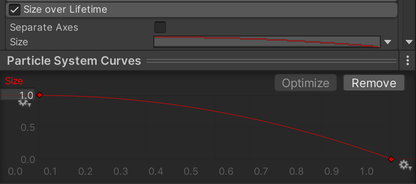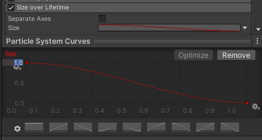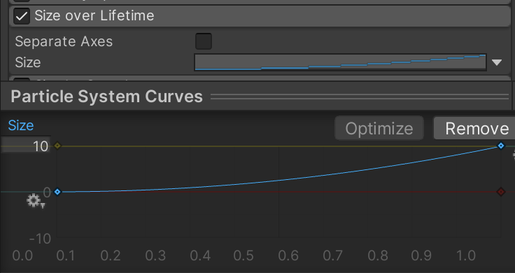 Enable Size over Lifetime. To configure this curve, you should expand the Curves tool at the bottom of the Inspector. The last preset icon is the curve shape needed for this effect. It is extremely important to make sure the Size (on the left of the curve chart) matches the diagram. A correct curve shape could still be ten times too large or too small if size is incorrect.