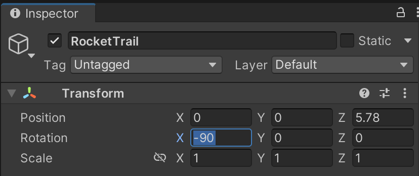 Create a RocketTrail game object with these 3 child game objects.