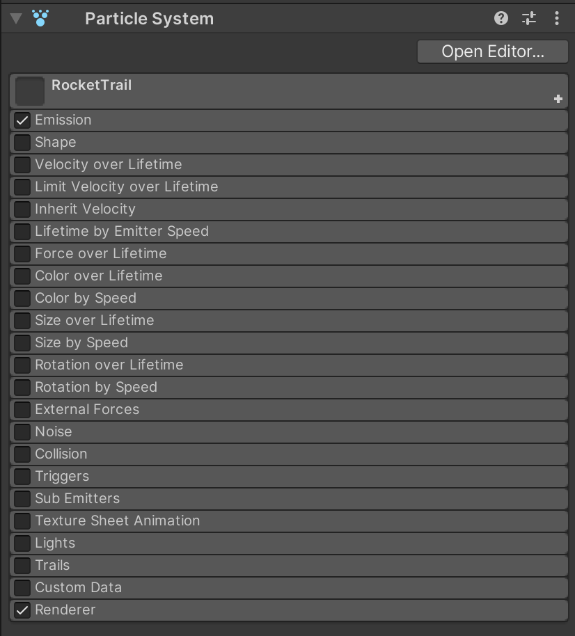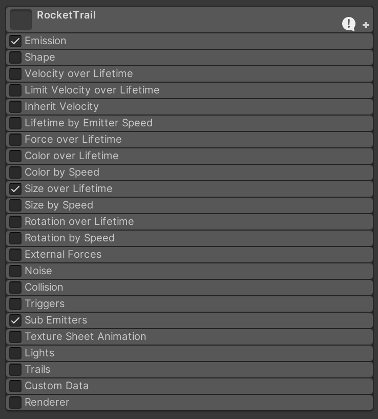 We'll start with the parent RocketTrail system and then work through the children systems. Attach a Particle System component to Rocket Trail. Turn off all of the components except Emission and Renderer. We will eventually turn off the renderer on this system. For now, it is on for debug and visualization purposes.