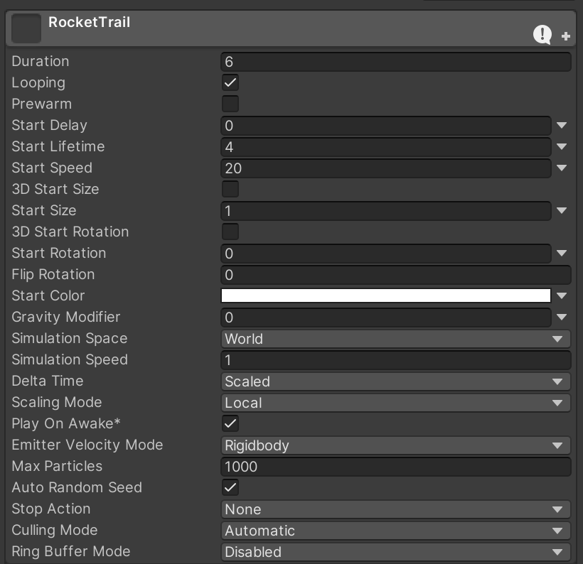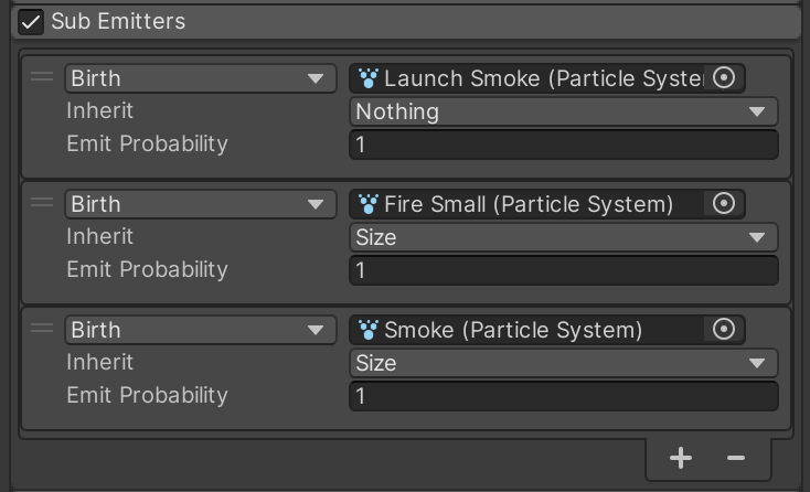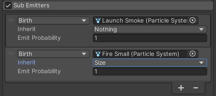 Back on the parent RocketTrail particle system, add the Fire Small particle system as a child sub-emitter. It should inherit the size of the parent Rocket Trail particle system.