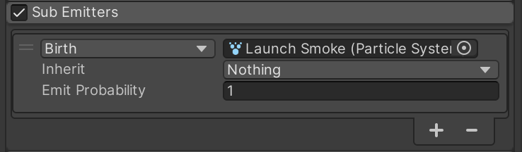Back on the parent RocketTrail particle system, add the Launch Smoke particle system as a child sub-emitter. It should inherit the size of the parent Rocket Trail particle system.