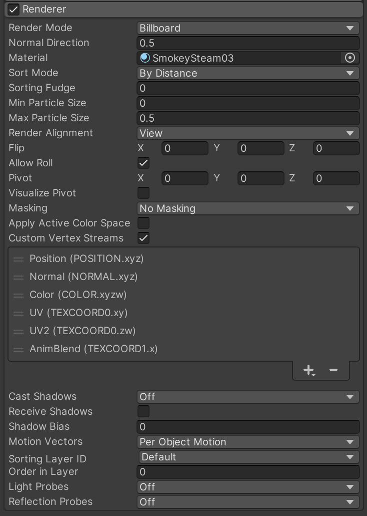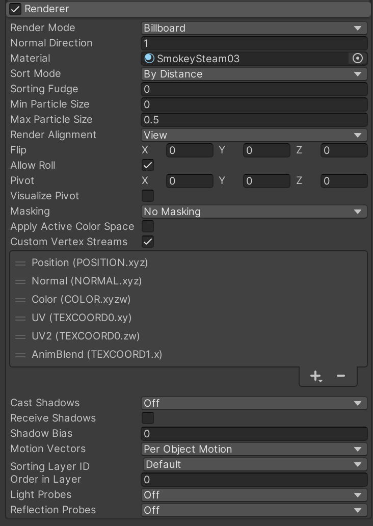 Skip to the Renderer for Launch Smoke and fill in these settings so the smoke will be properly visible as we configure it. Remember that you can automatically fill in all of the Custom Vertex Streams by inspecting the SmokeySteam03 material asset and clicking "Apply."