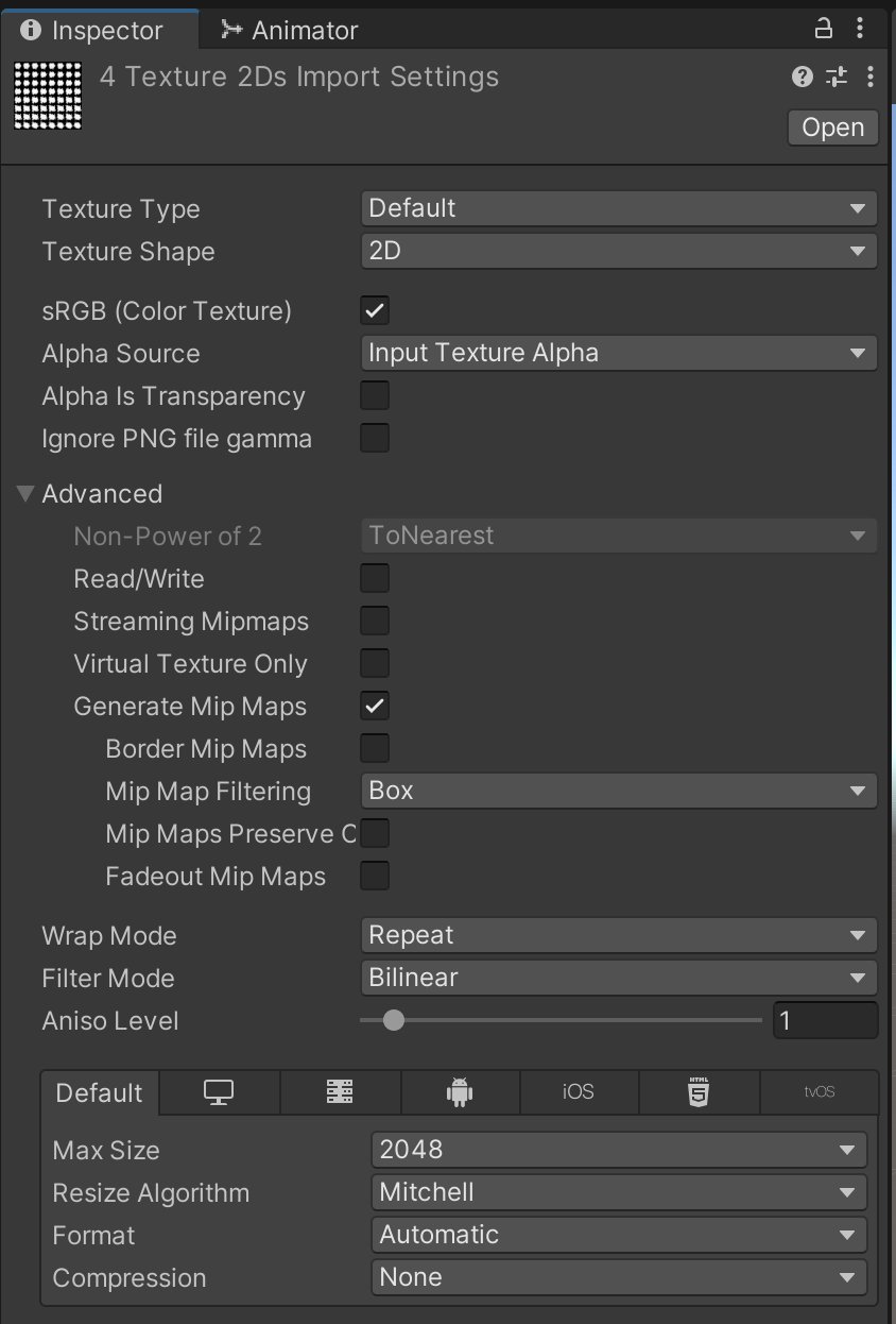 You can configure all 4 textures at once by selecting them at the same time. Check that each of the textures has the correct import settings.