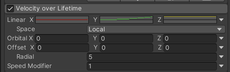 These Velocity over Lifetime settings will cause the particles to increasingly rise over time (y-axis velocity) and spread out (z-axis velocity). Take special notice of the Radial value which will project the particles outward from their origin.