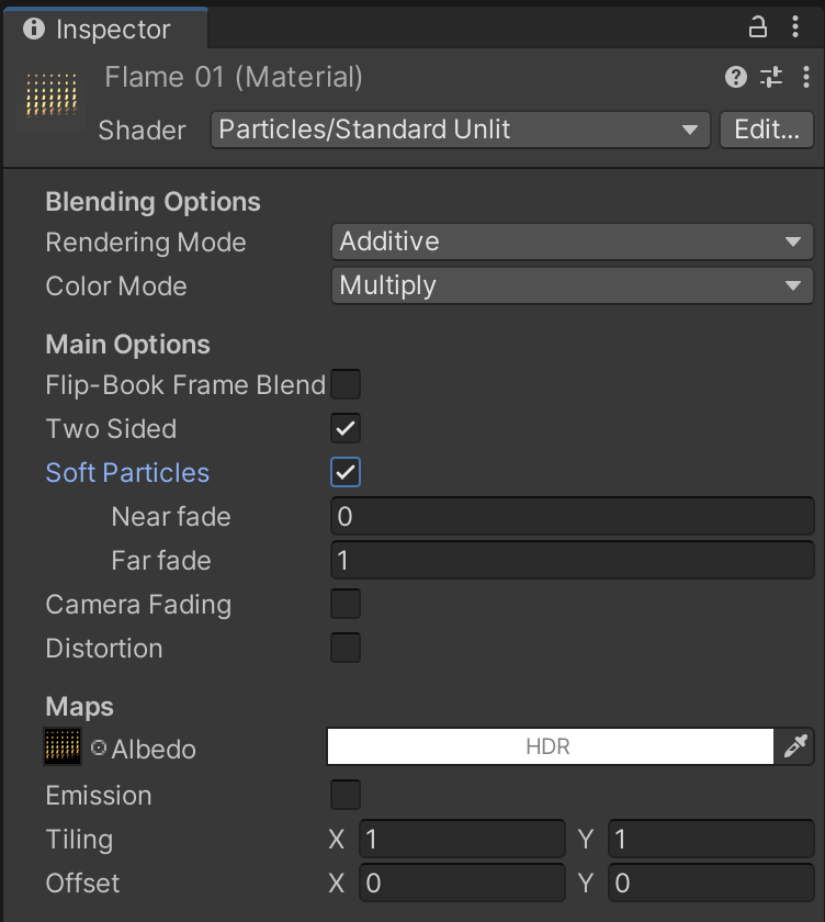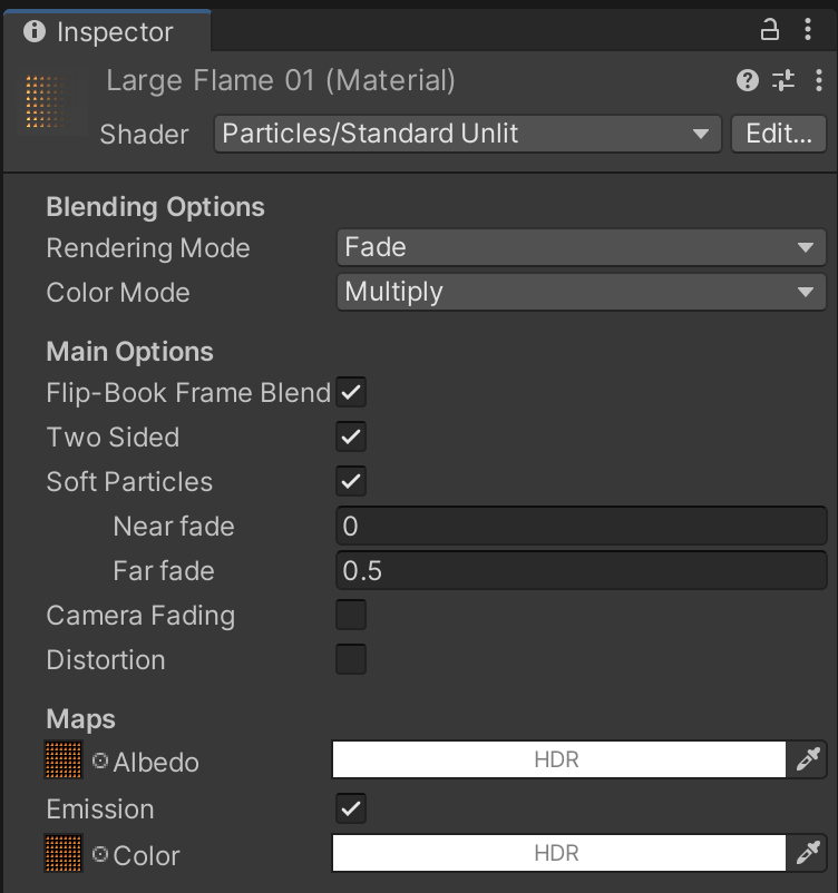 The LargeFlame01 material will use the LargeFlame01 graphic as a texture, but notice how it uses it for both albedo and emission to create a self-illuminating effect. Be sure to match any other settings.
