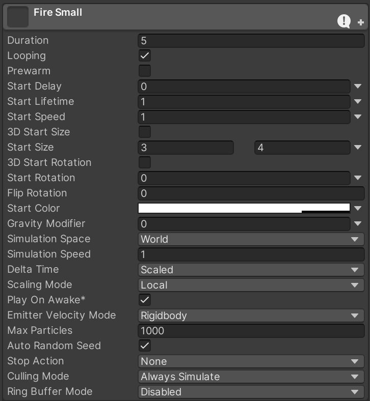 Return to the small fire particle system and configure the main settings for Fire Small.