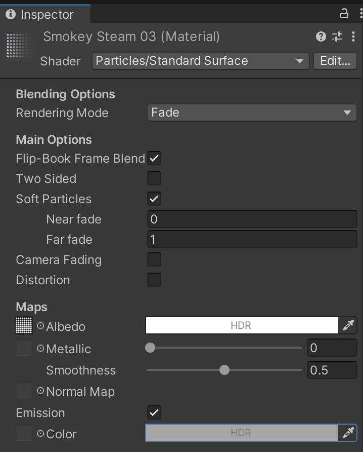 The SmokeySteam03 material uses the smokeysteam graphic for texturing and a surface shader. Notice that it has a grey-tinted emission (with no texture) in order to create the effect of steam scattering light. Be sure to match any other settings.