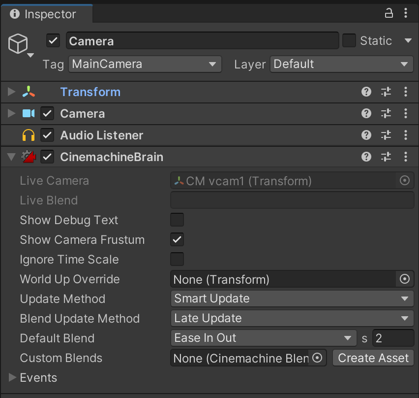 You should notice two changes: 1) A Cinemachine Virtual Camera object has been added to the scene, and 2) Your new Camera has a Cinemachine icon indicating that it has gained a CinemachineBrain component that links to the new Virtual Camera.