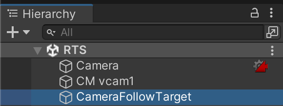 Create a new script called RTSCameraController.cs and attach it to the new CameraFollowTarget. We will use this script to control the follow target of the camera.