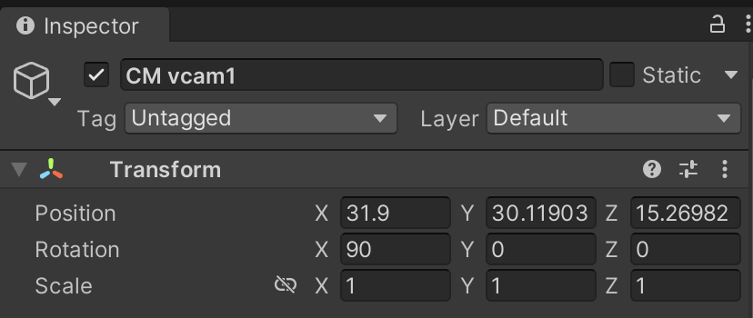 Inspect the virtual camera object. Because our camera will always face toward the ground, we will rotate it's X rotation to 90.