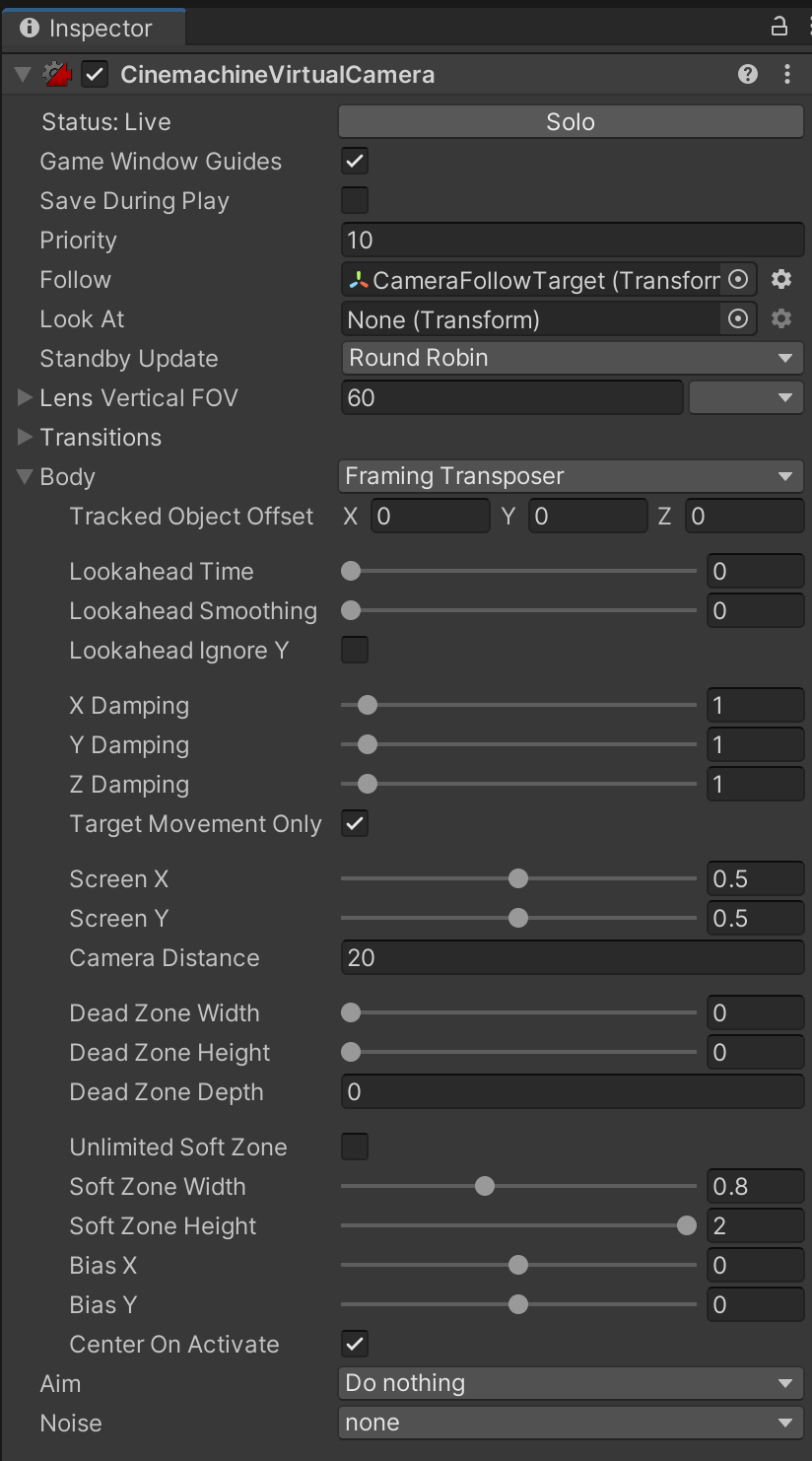 We want this virtual camera to follow the target as it moves around the screen. Because our camera only moves around and does not aim at different objects, leave the "Follow" property empty. Notice how "Camera Distance" imitates our desired 20 units value from the prior step.