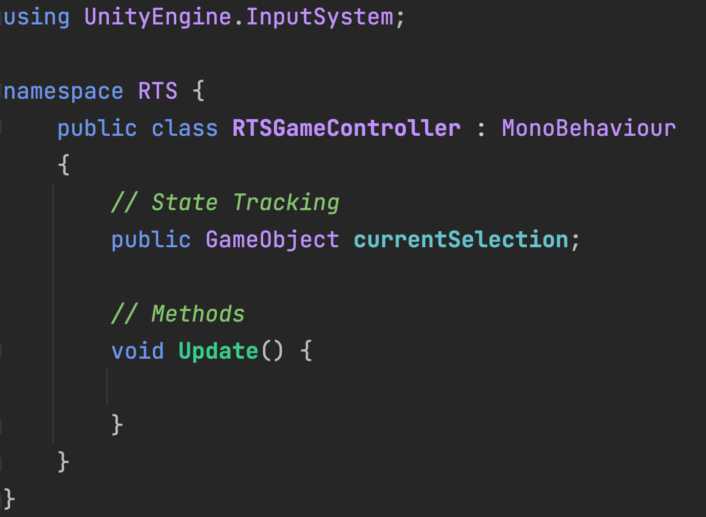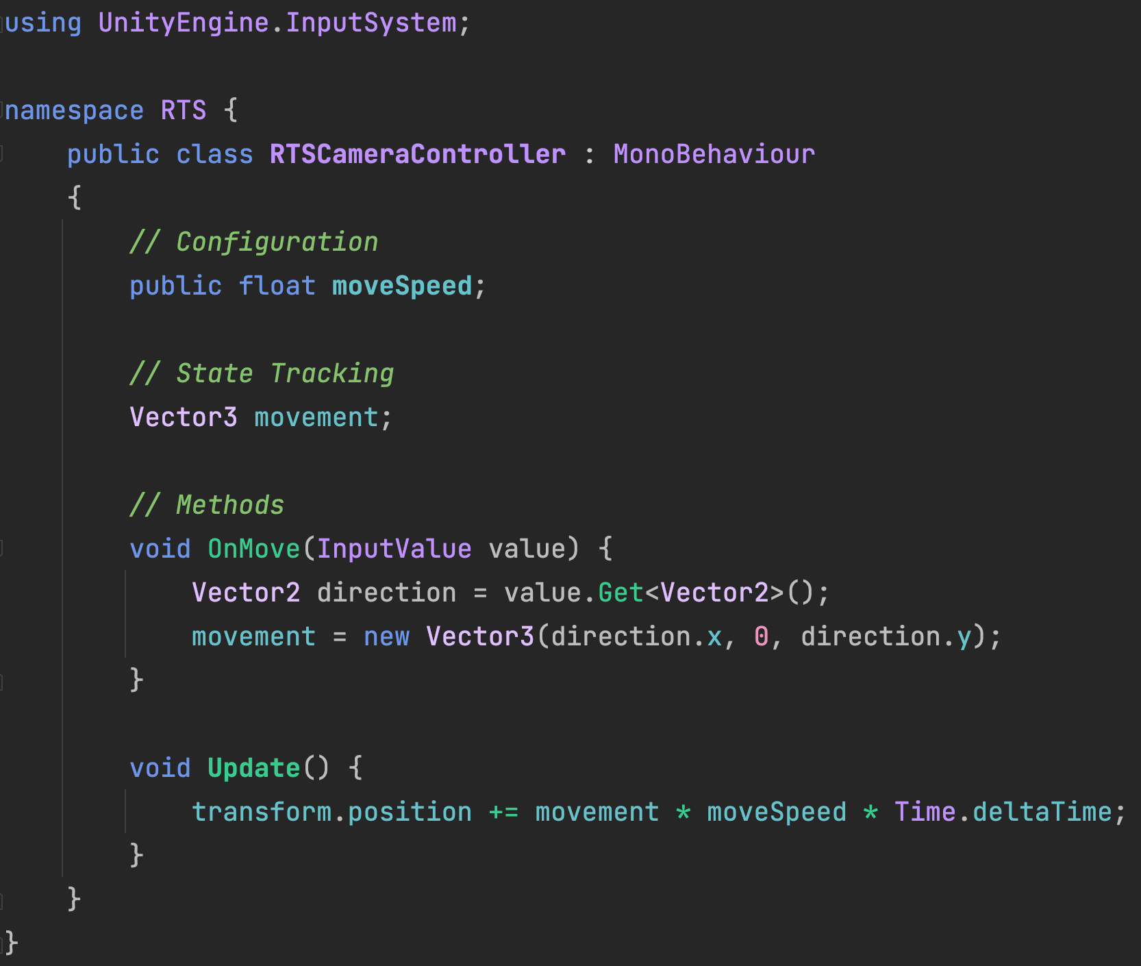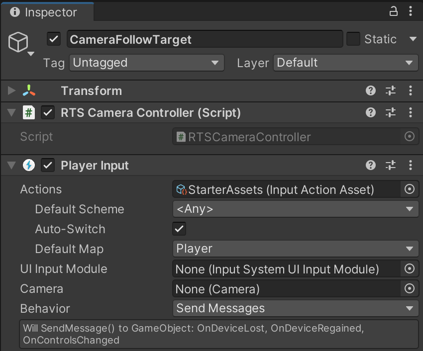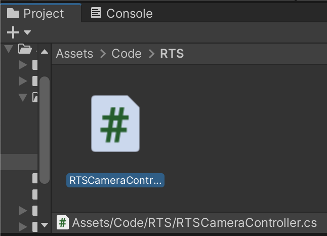 For this prototype, we will use the RTS namespace to avoid naming conflicts with other exercises. By measuring the Player Input (whether it be joystick, keyboard, etc.), we can move the CameraFollowTarget.