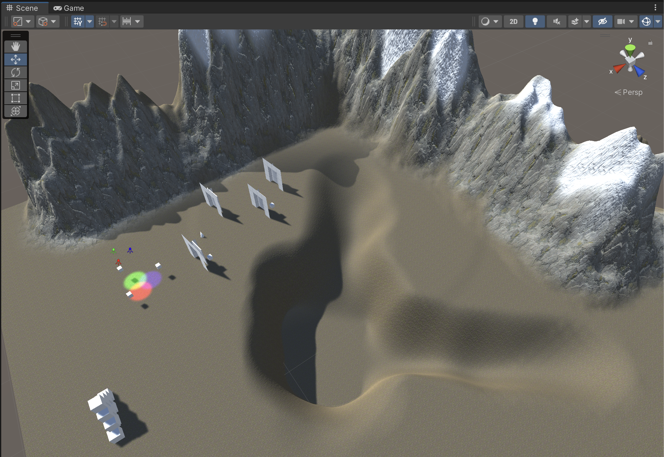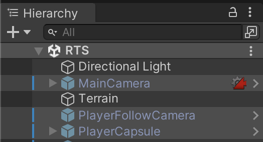 For this assignment, you'll return to your 3D environment from prior assignments. Duplicate one of these scenes and rename it to "RTS." Deactive the existing Camera and Player objects (selected in the picture below). The level must have movable physics-enabled boxes (which you likely created in a prior assignment).