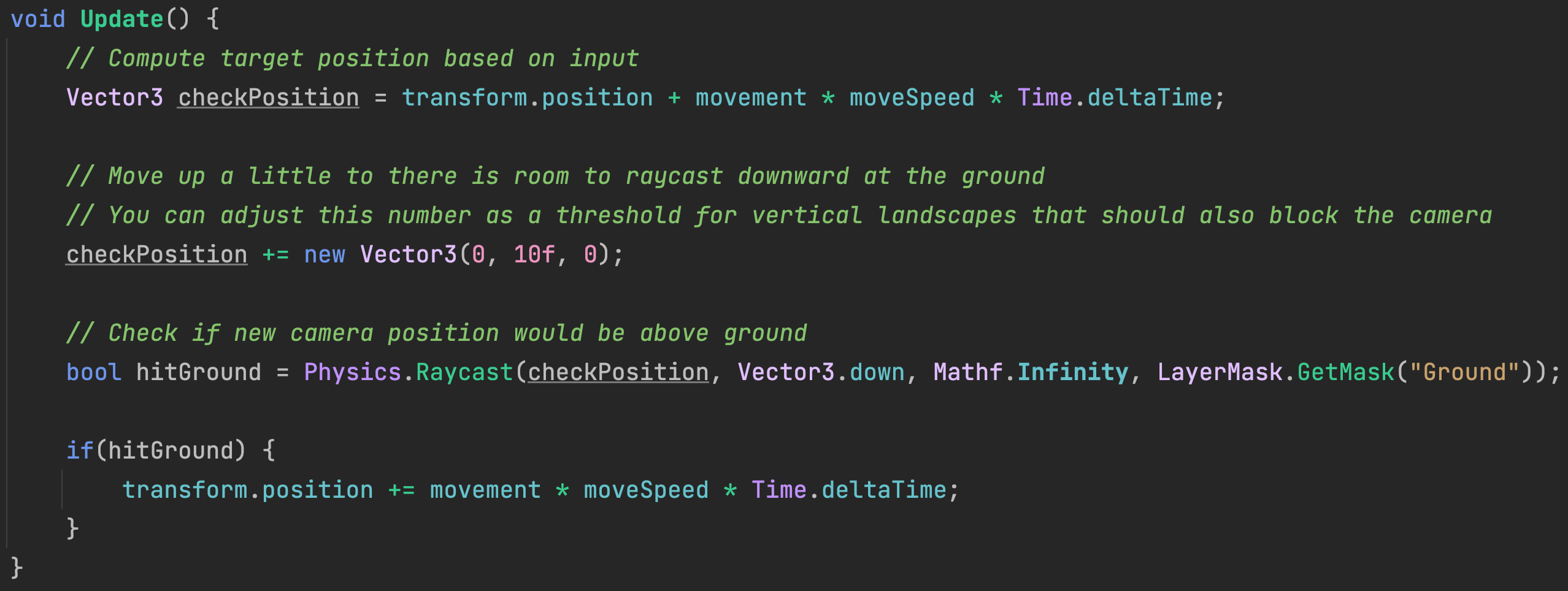 To prevent the camera from leaving the terrain, revise the Update method in RTSCameraController. We will raycast and check for ground below a candidate camera position before finalizing any movement in the CameraFollowTarget. If no ground is found, then that requested camera move will be rejected.