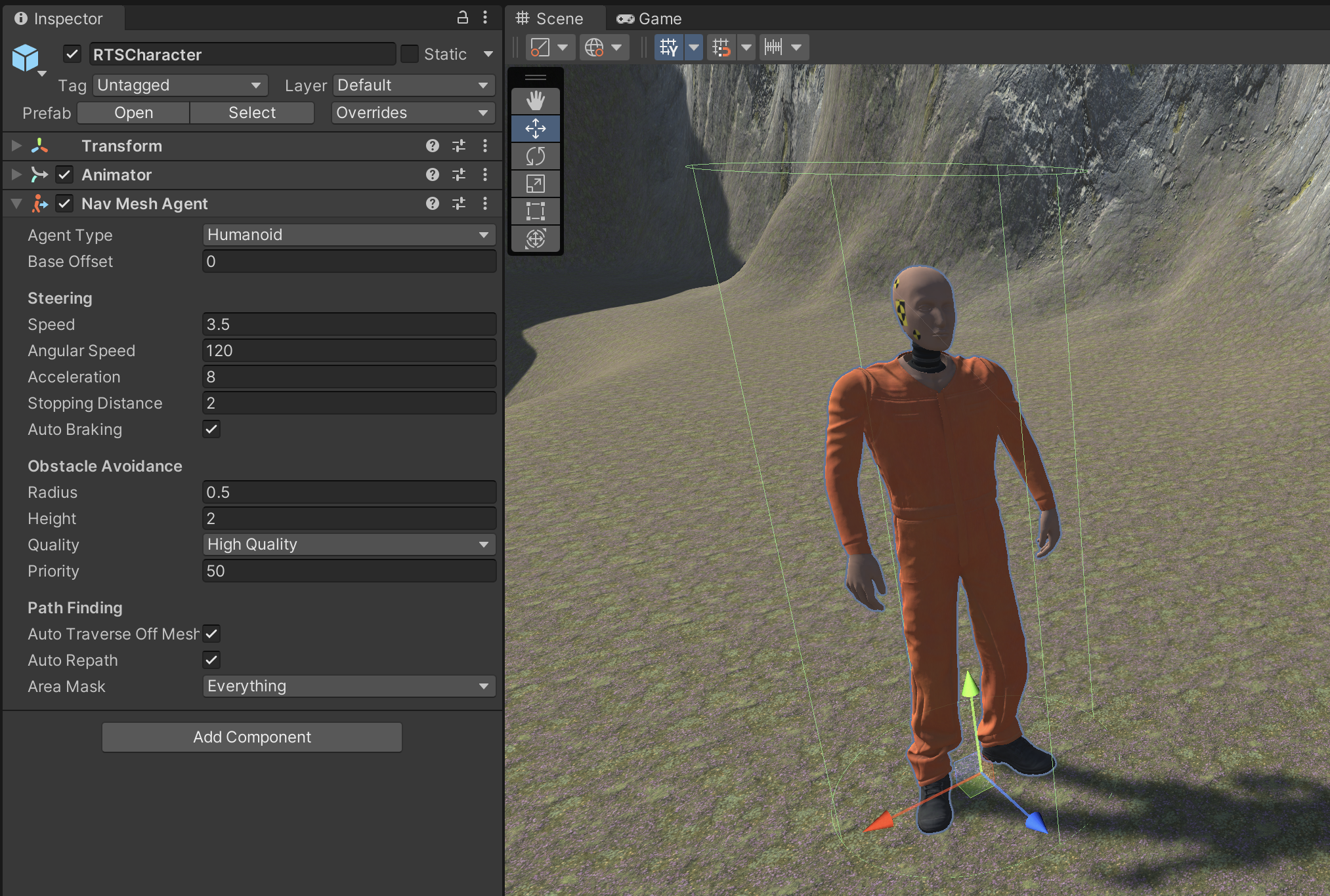 Find one of your finished characters and duplicate them for this assignment. Place them somewhere accessible on the map where they can be selected and told to run around. Remove the Enemy script, so that you are left only with Transform, Animator, and NavMeshAgent. Prefab this RTSCharacter, since we will be making several of them for our game.