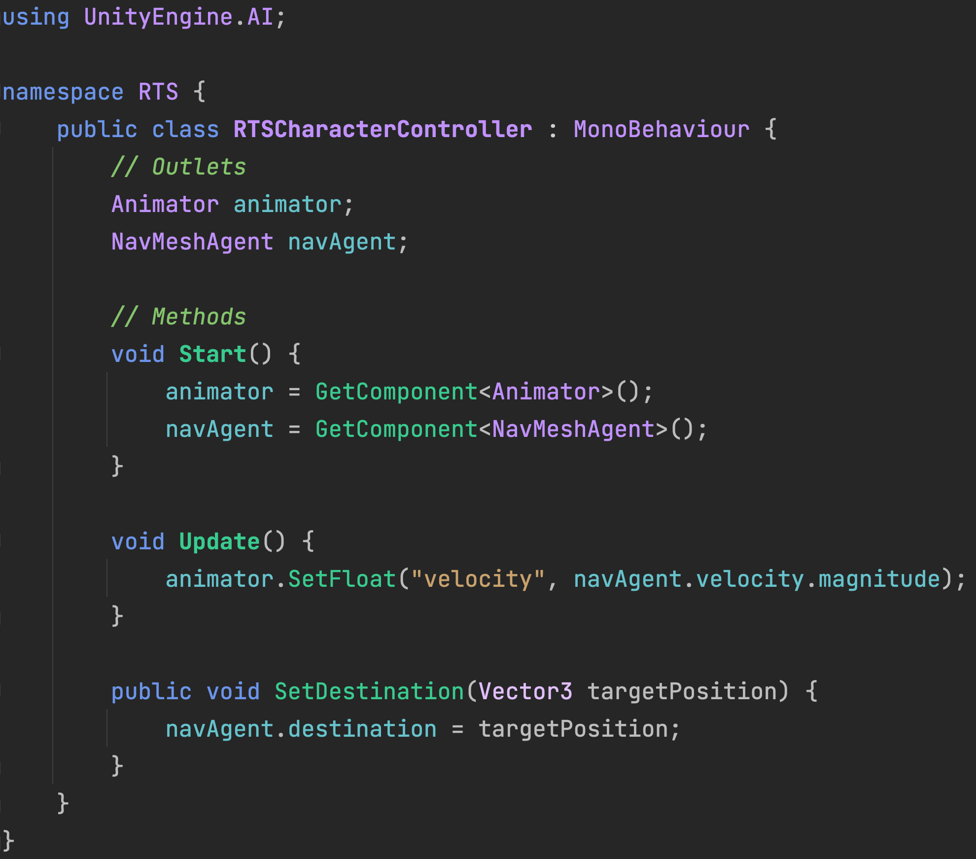 Create an RTSCharacterController.cs file and attach it to your RTSCharacter. (Be sure to keep your prefab updated with any changes.) The SetDestination public function will be called to tell this character where to go. This file maintains the same velocity code from the Enemy script for driving the animator.