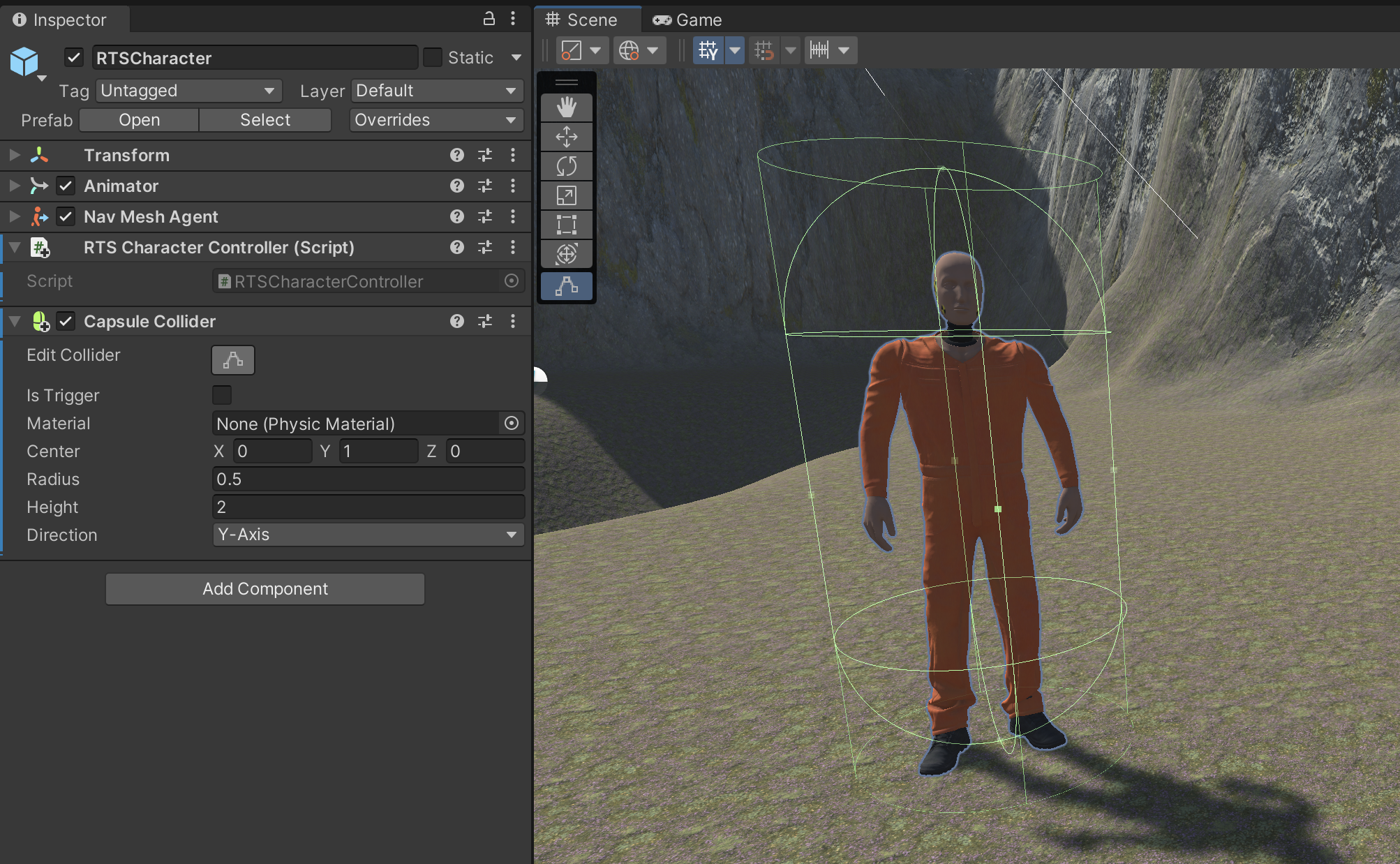 Finally, in order for our player to be clickable, it needs to have a shape for the physics engine to compute raycast intersections. Add a CapsuleCollider to your RTSCharacter, and adjust its size to roughly approximate your character. (Full game productions would use character colliders of differing accuracy depending on the needs of the game.)
