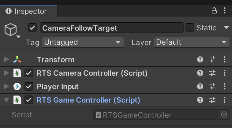 Create an RTSGameController.cs file and attach it to the CameraFollowTarget.