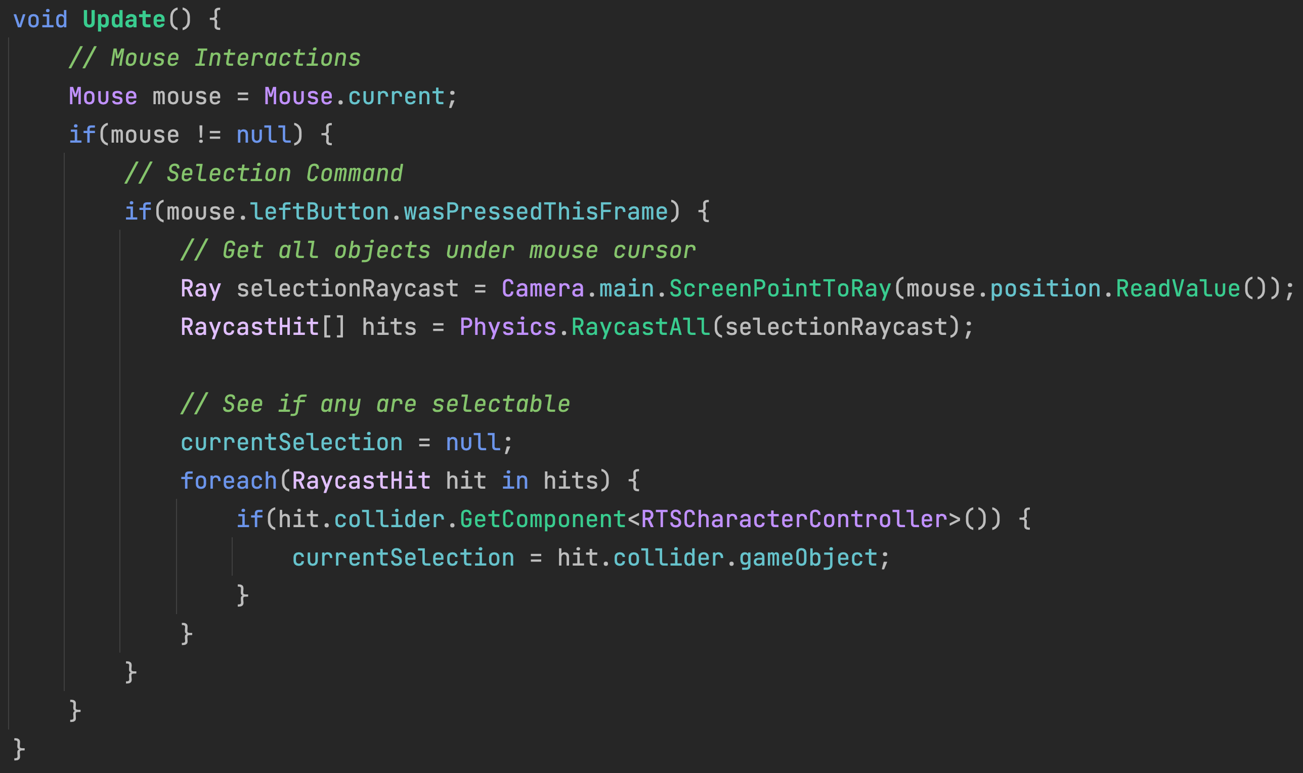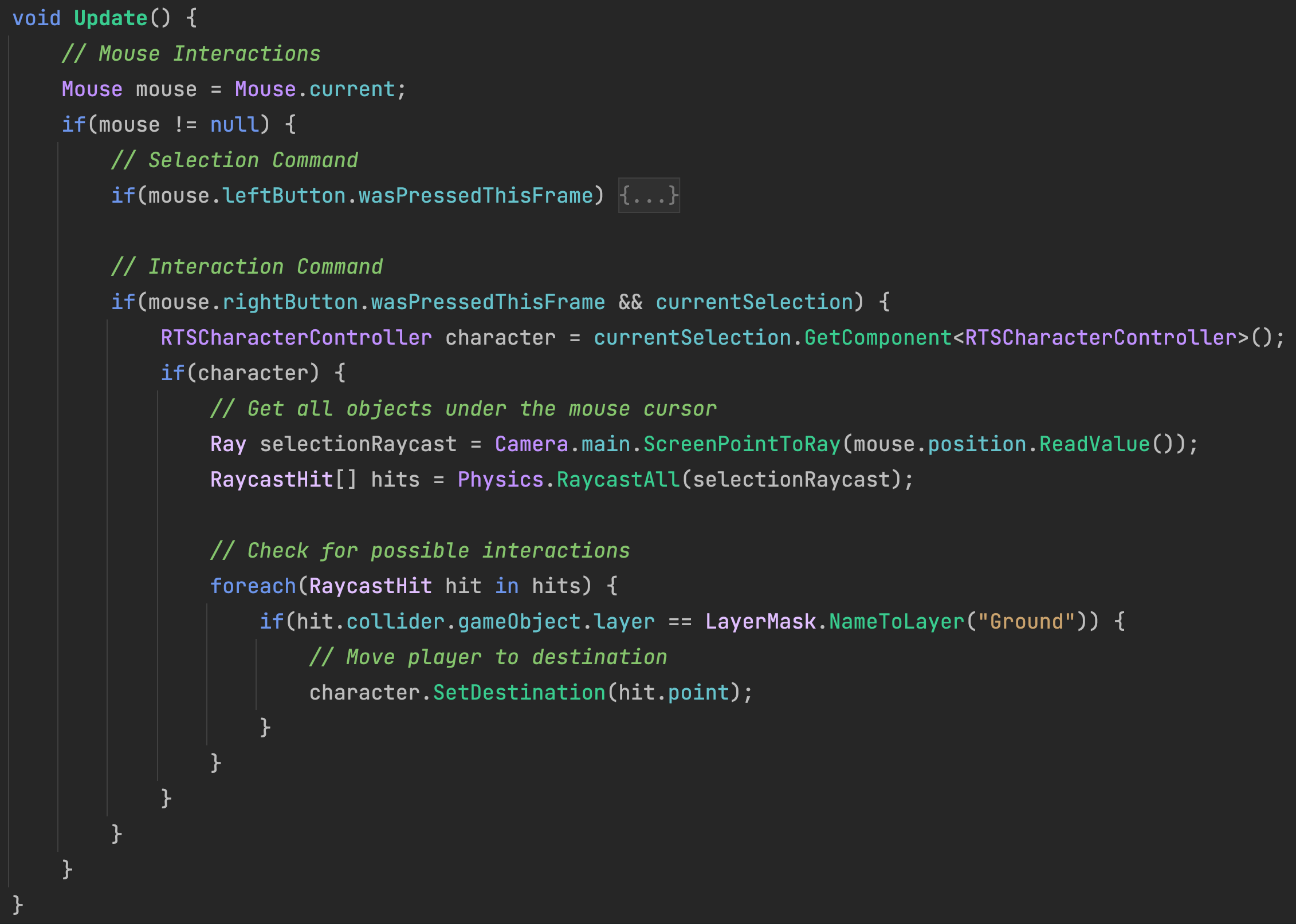 The RTSGameController manages interactions within the game. Left-clicking will select an object and set it as active by storing it in the currentSelection variable.