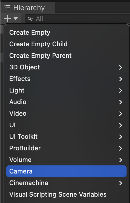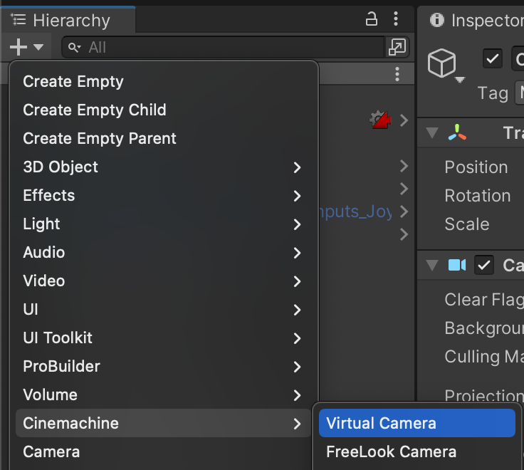 To smoothly move our camera around the environment, we will use the Cinemachine package. Cinemachine uses virtual cameras which act like camera operators who move and aim cameras based on a configured set of behaviors. Add a Cinemachine Virtual Camera to the scene using the create menu.