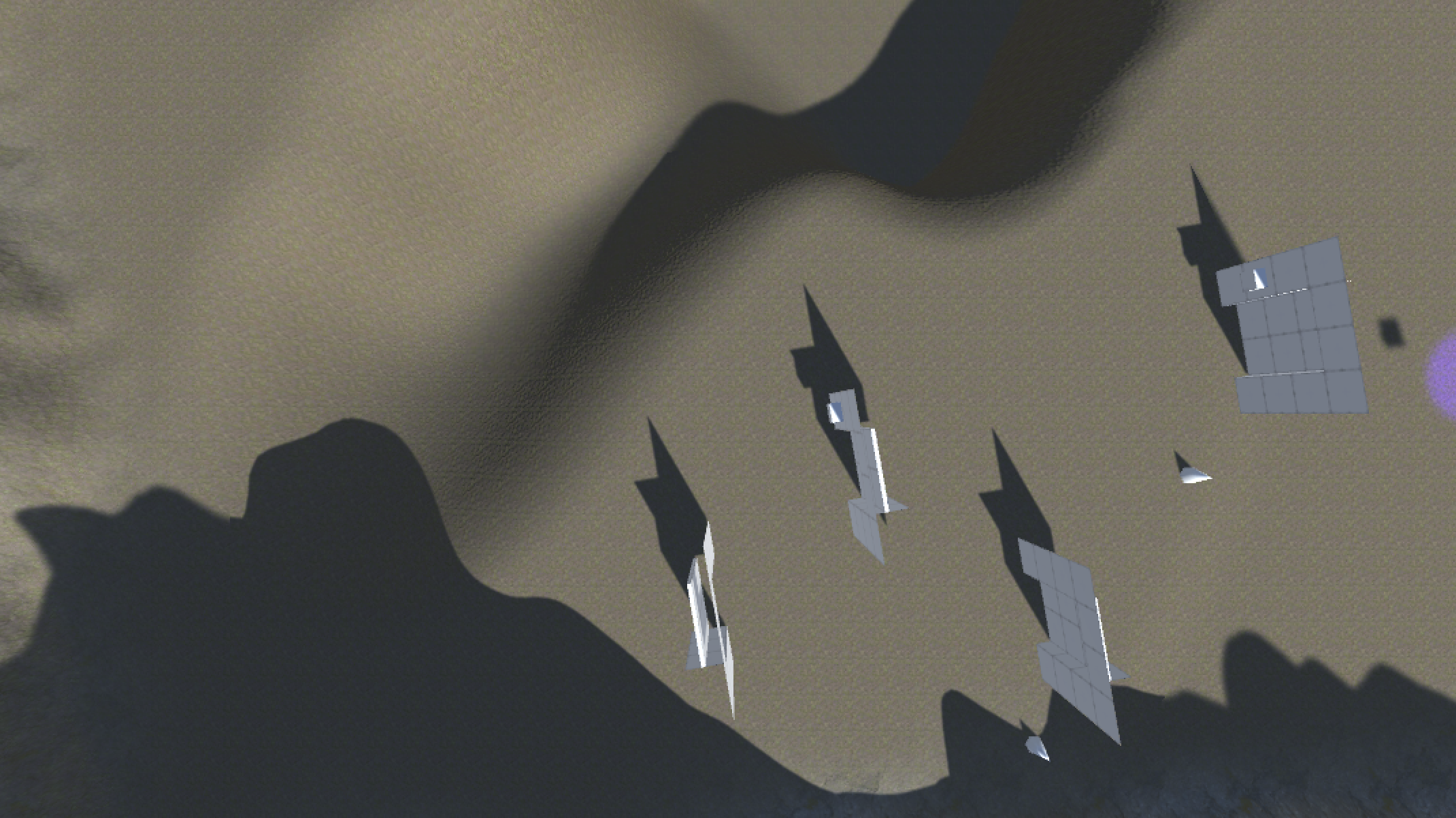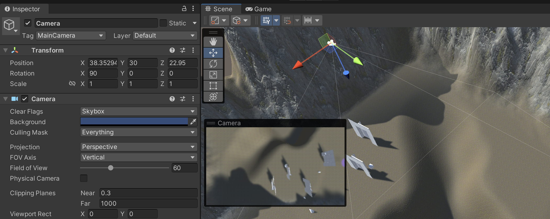 Rotate this new camera so that it faces downward with an altitude of 20 meters above the base height of the terrain. (If the terrain surface is at 10, then the camera Y should be 30.) The camera should also be tagged as MainCamera.