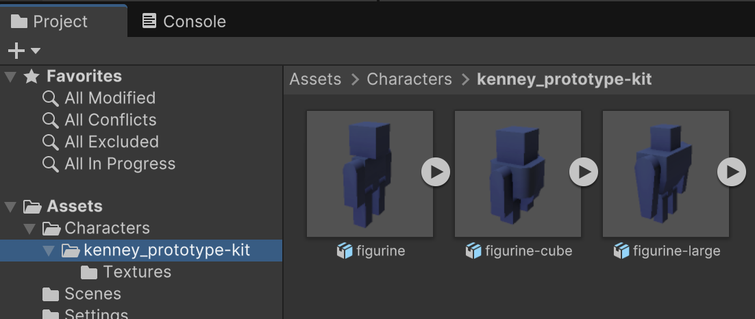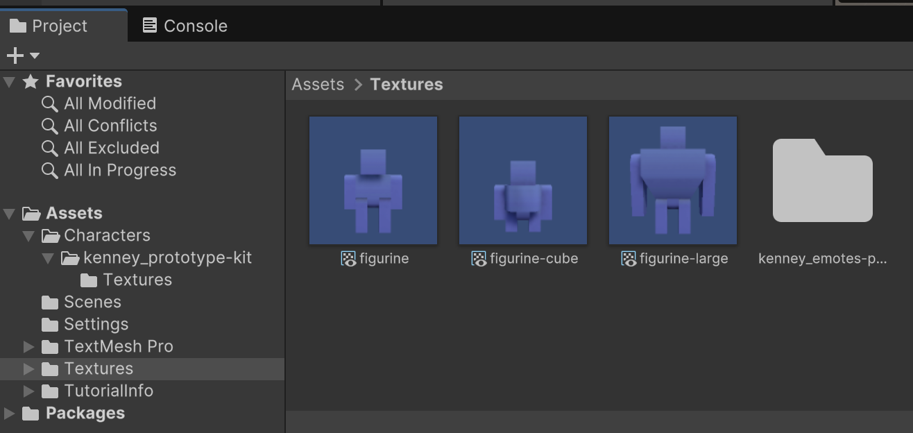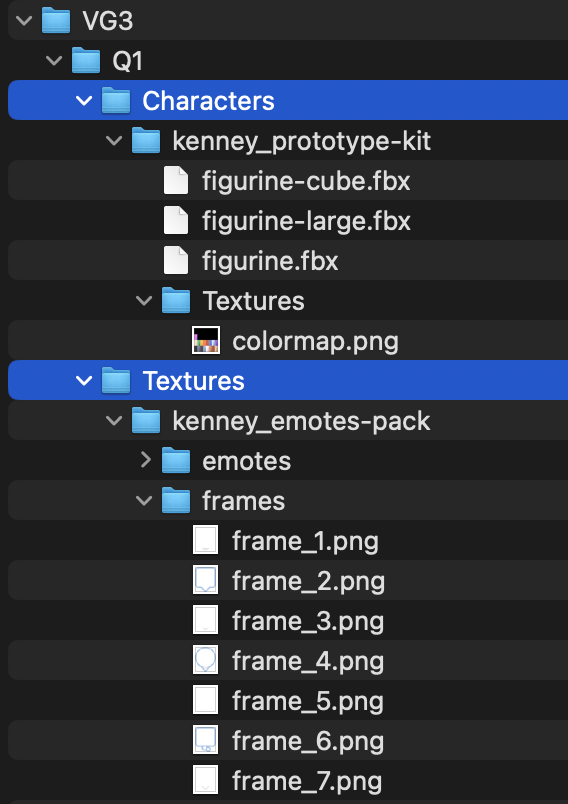 In the course files, find the "Q1" folder and add its "Characters" and "Textures" folders to the root of your project assets. You should be able to find three character models from the Kenney Prototype Kit in the Characters folder and a collection of emotes and frames from the Kenney Emotes Pack in the Textures folder.