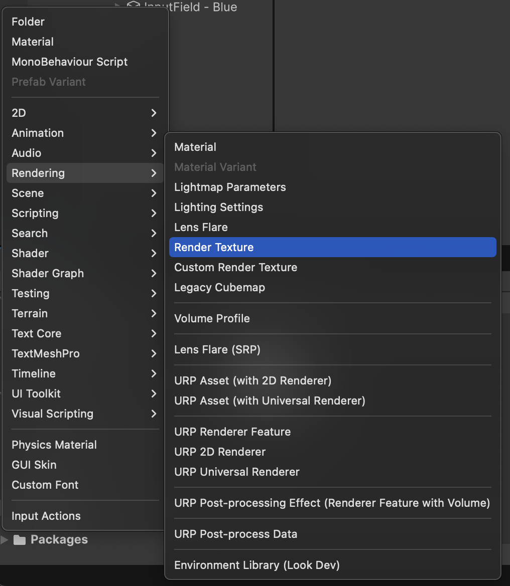 Render Textures are saved as Project Assets that can then be accessed during runtime gameplay execution. To prepare our Render Textures, use the Project tab to navigate to the /Assets/Textures/ folder. Click the + in the Project tab, and select Rendering > Render Texture.