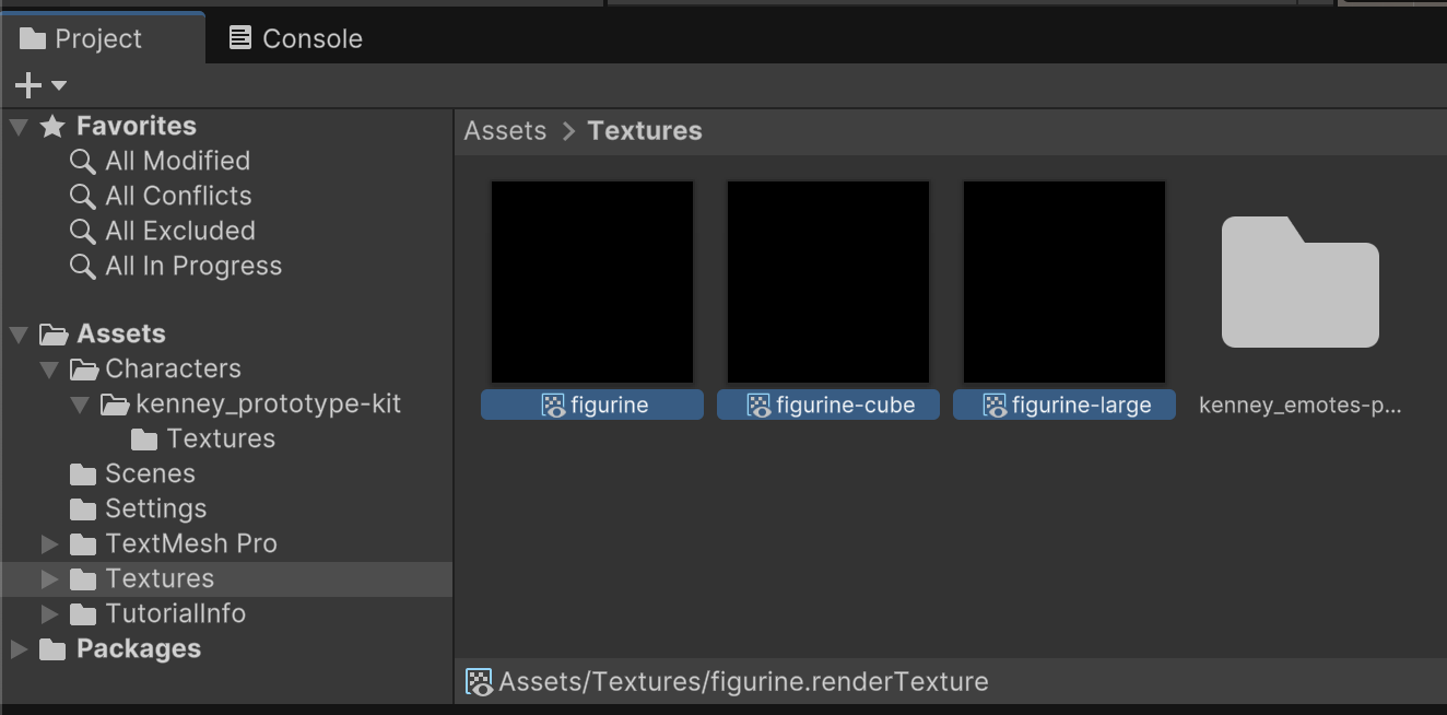 Repeat this process until you have three Render Textures. Name the file for our three character model options of "figurine", "figurine-cube", and "figurine-large".