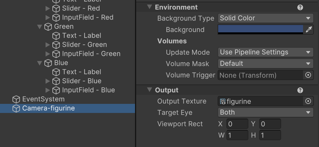 Next, a Camera is hooked up to a target Render Texture. We want to leave the existing Main Camera available to render the background and any other content for the scene. Main Camera will not be used as part of our steps. Instead, we will add additional cameras. Start by adding a new Camera to the scene hierarchy. Name is "Camera-figurine" and customize its Environment settings to render a transparent background instead of the default Skybox. In the Output settings, drag the "figurine" Render Texture into the Output property. This camera now dynamically stores its perspective in the figurine image.