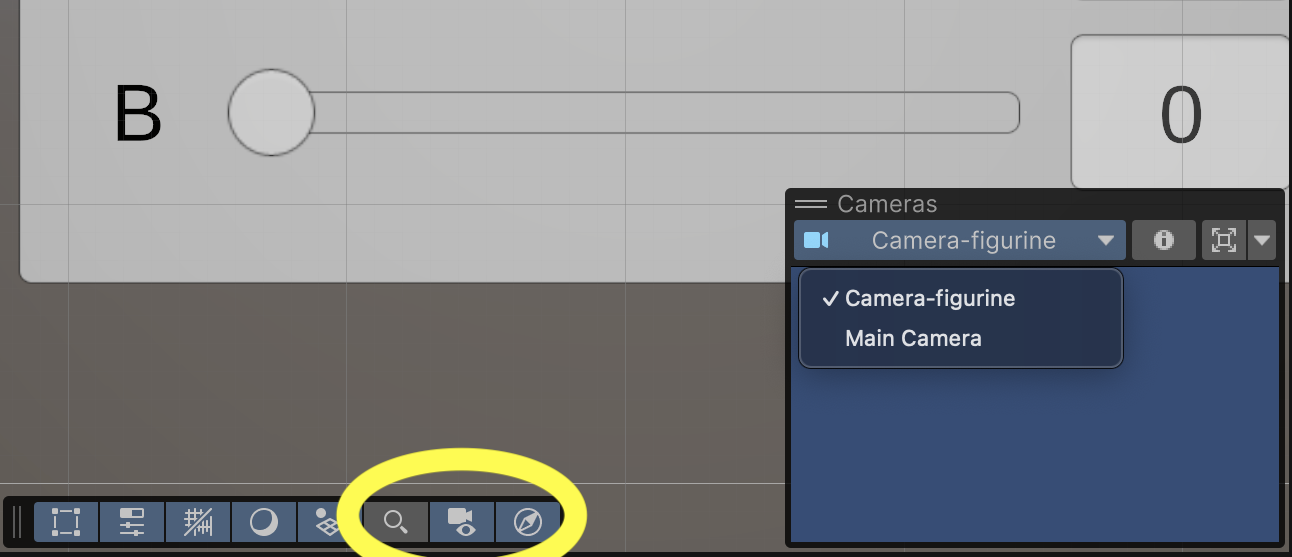 Previewing what your new Camera is seeing can be difficult because it is outputting to a Render Texture instead of the display. In the Scene Tools, there is an option to turn on a Cameras tool which will let you preview the "Camera-figurine".