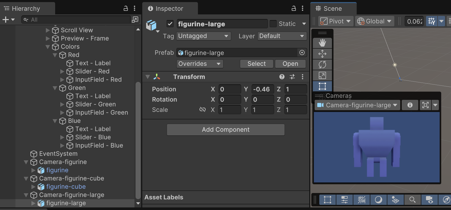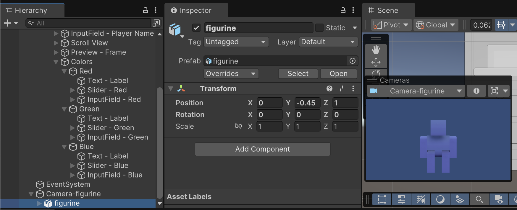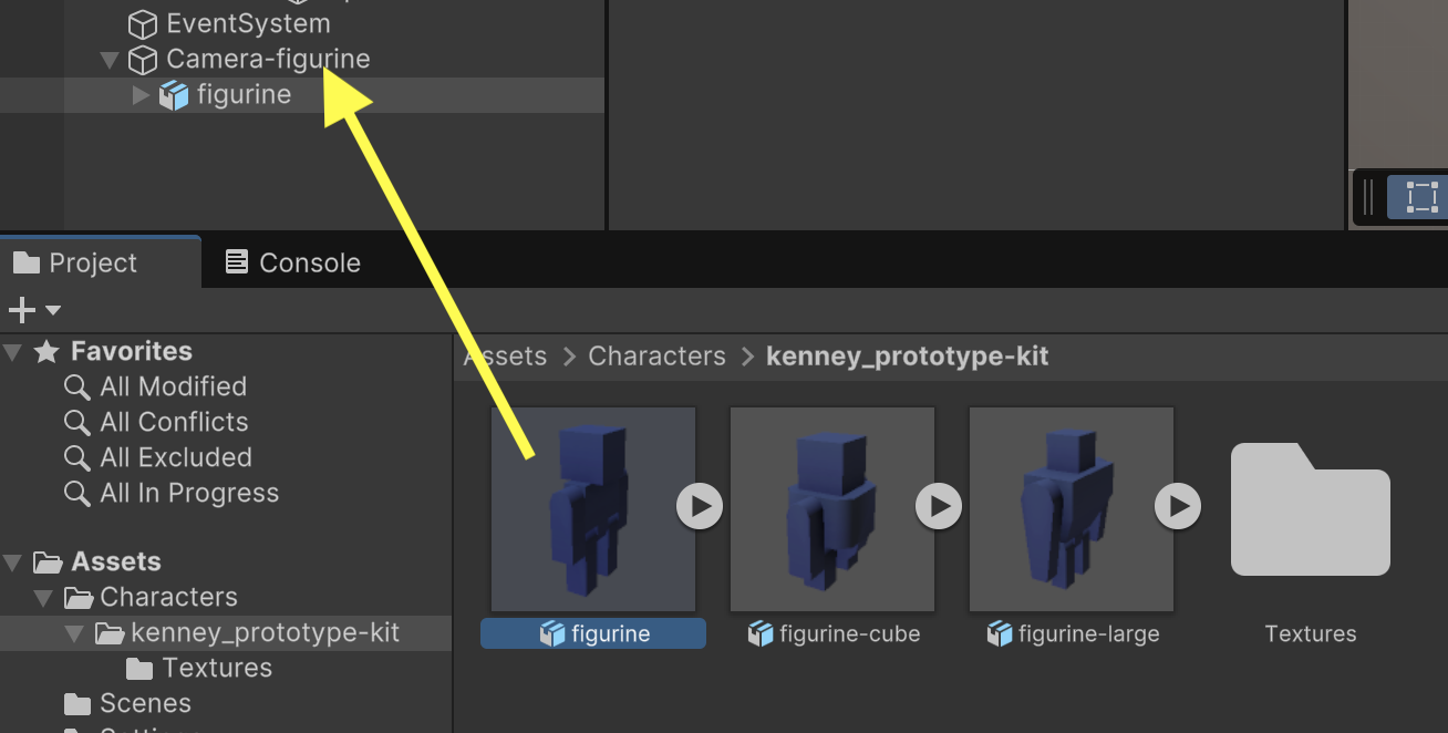 In order for our camera to see our 3D model, we must add the model to the scene. Drag the "figurine" 3D model into the scene as a child of "Camera-figurine". Having the model as a child of the camera helps ensure that wherever we move or organize the camera, the character model will stay in the proper position.