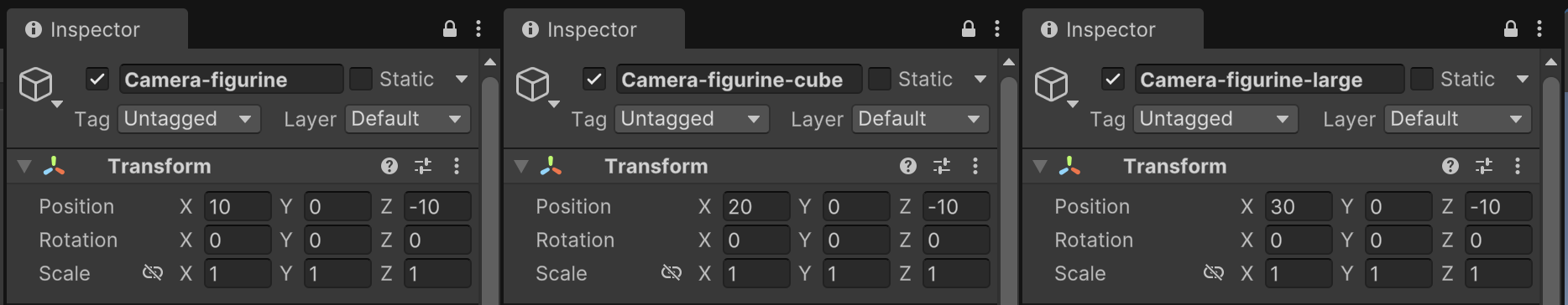 We want to repeat this process for the other two character models, creating two additional cameras and positioning a child model inside each of them.
