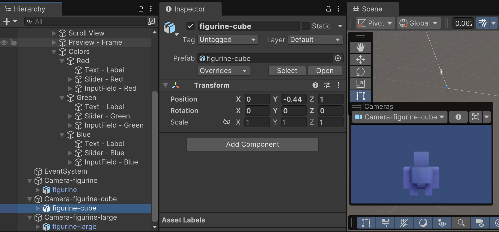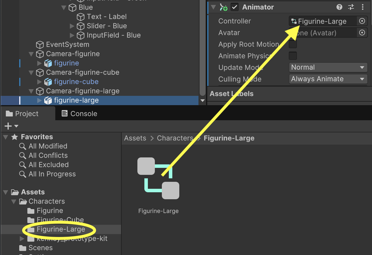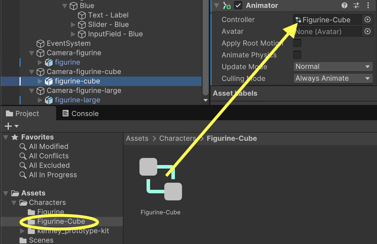 Repeat this process for both the "figurine-cube" and "figurine-large" gameObjects paying special attention to make sure each object has a different animator controller of its own.