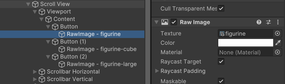 Now that our cameras and models are set up, we can add the render textures to our UI. Within the Scroll View content, we previously made three buttons each with a RawImage inside.