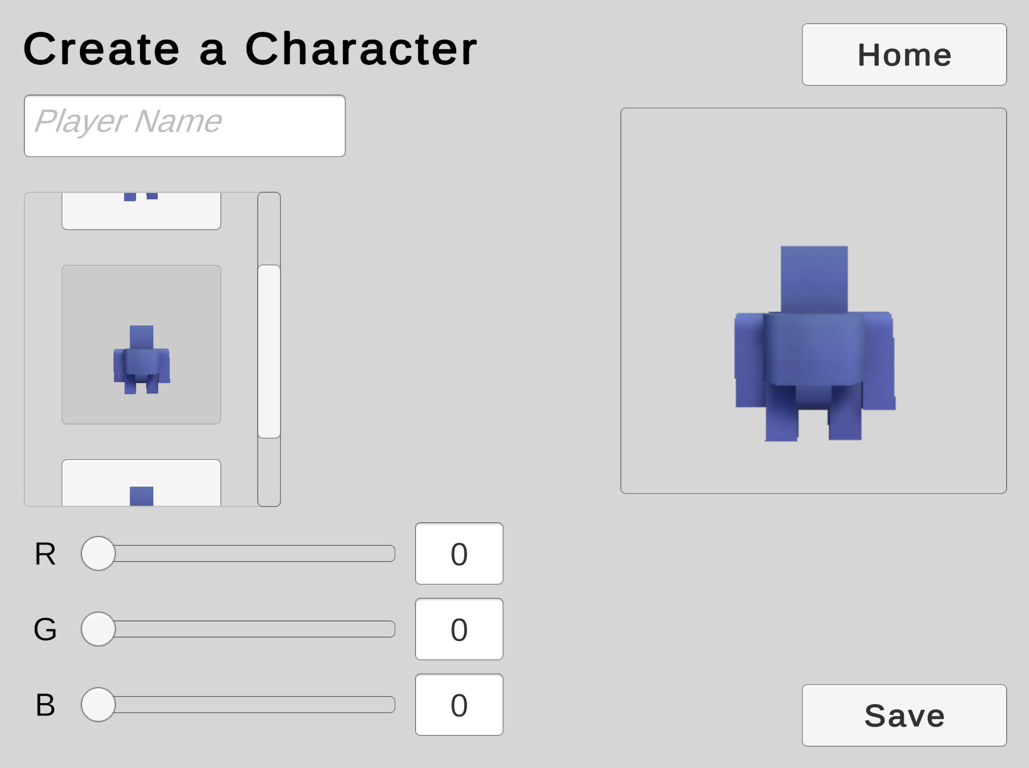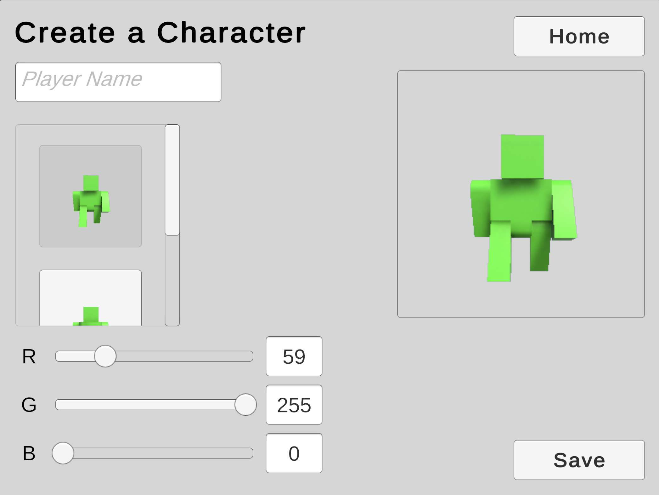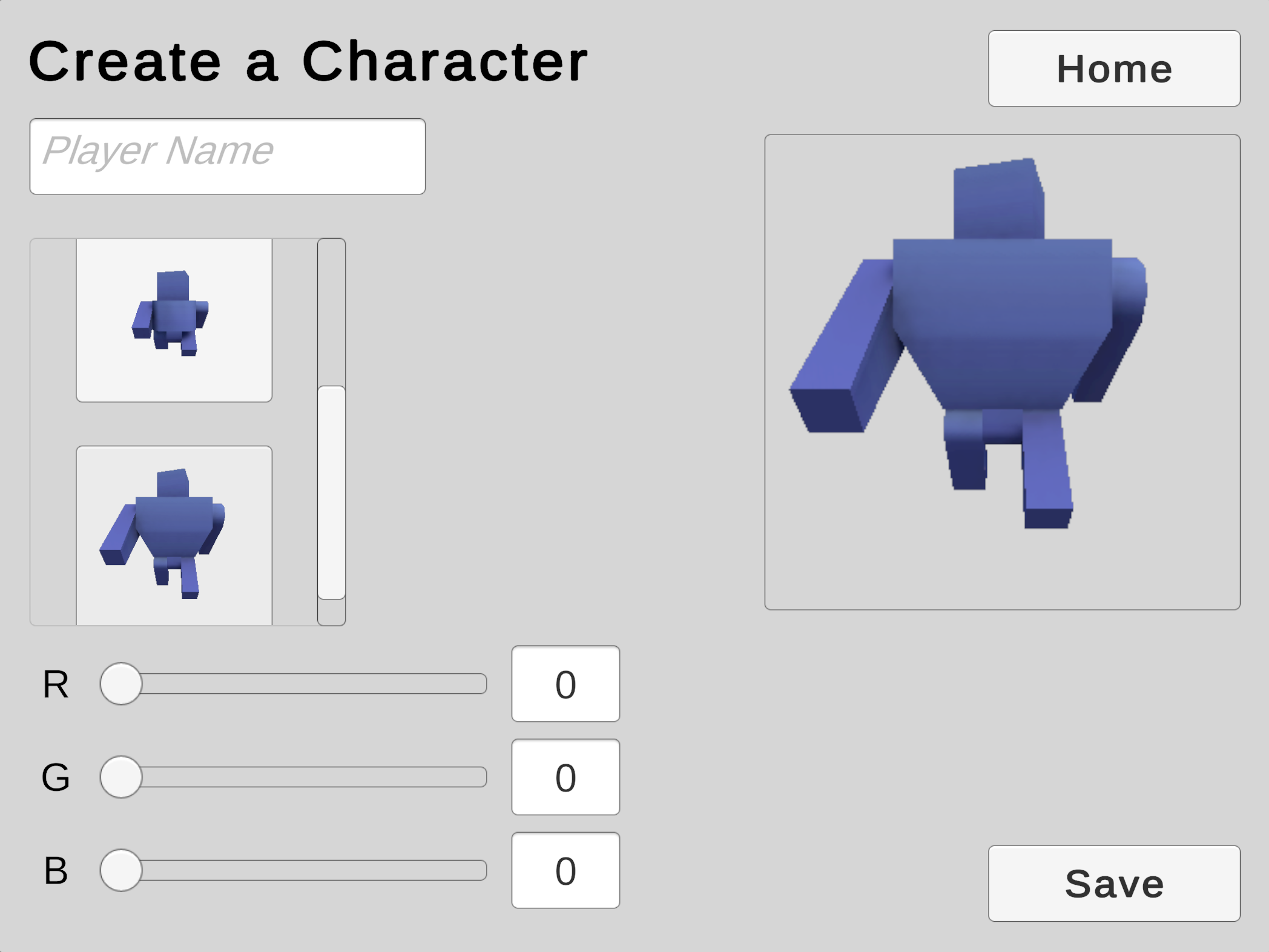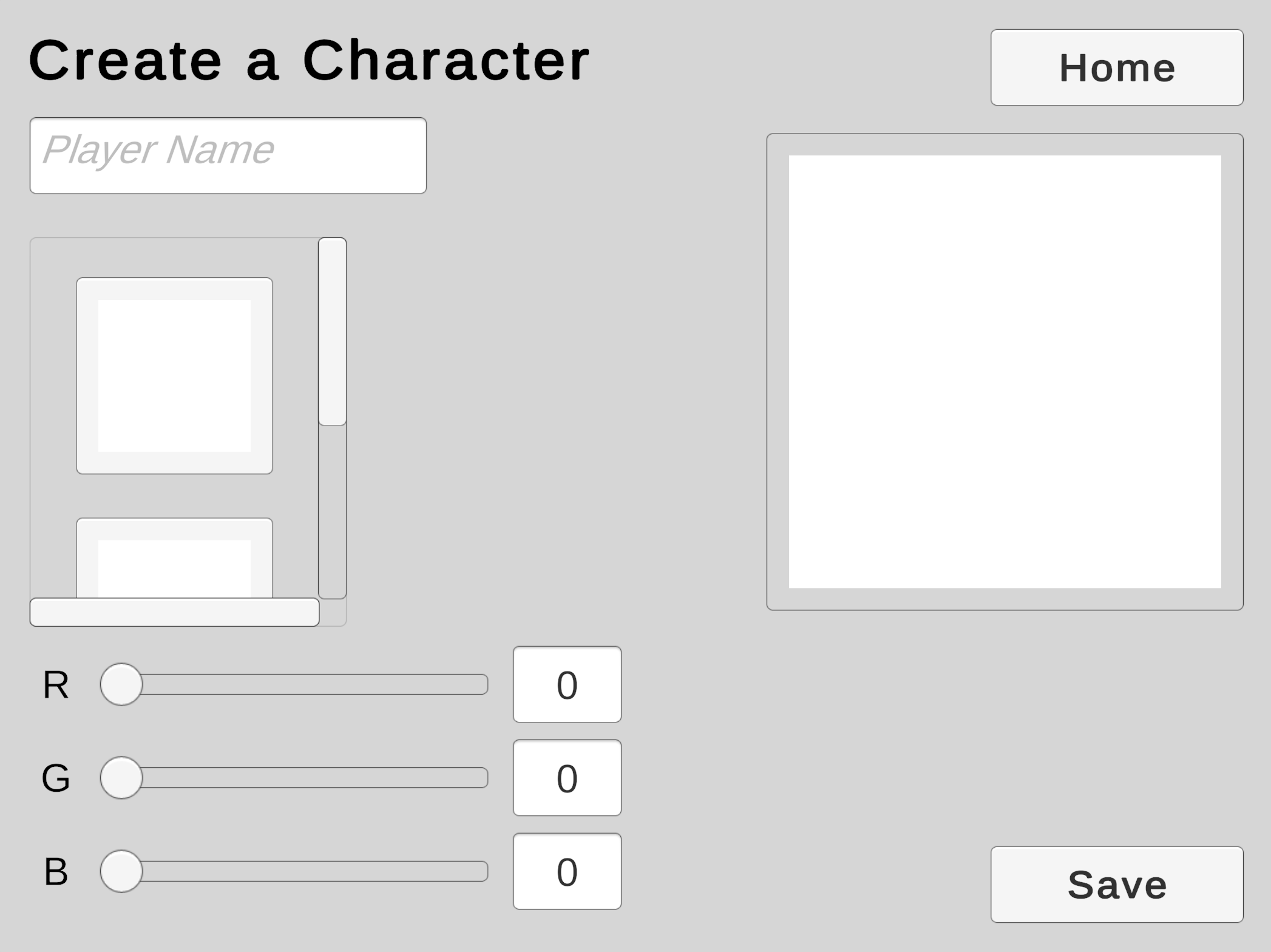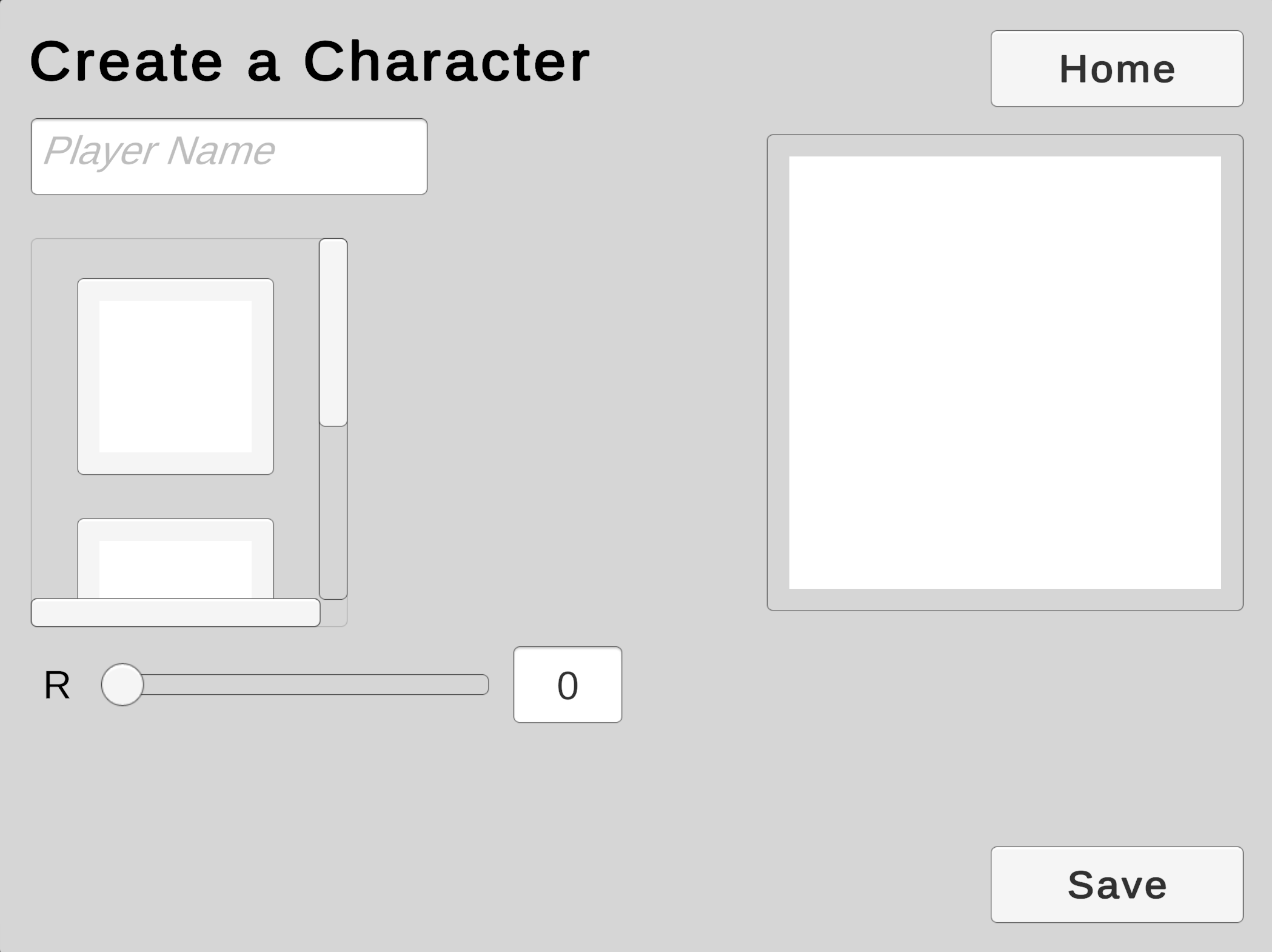 We will use a Scroll View to offer the player a choice from a collection of character models.