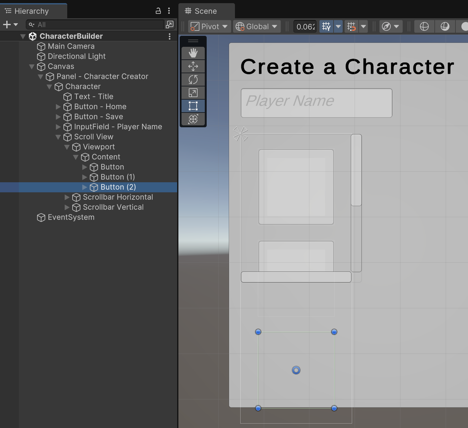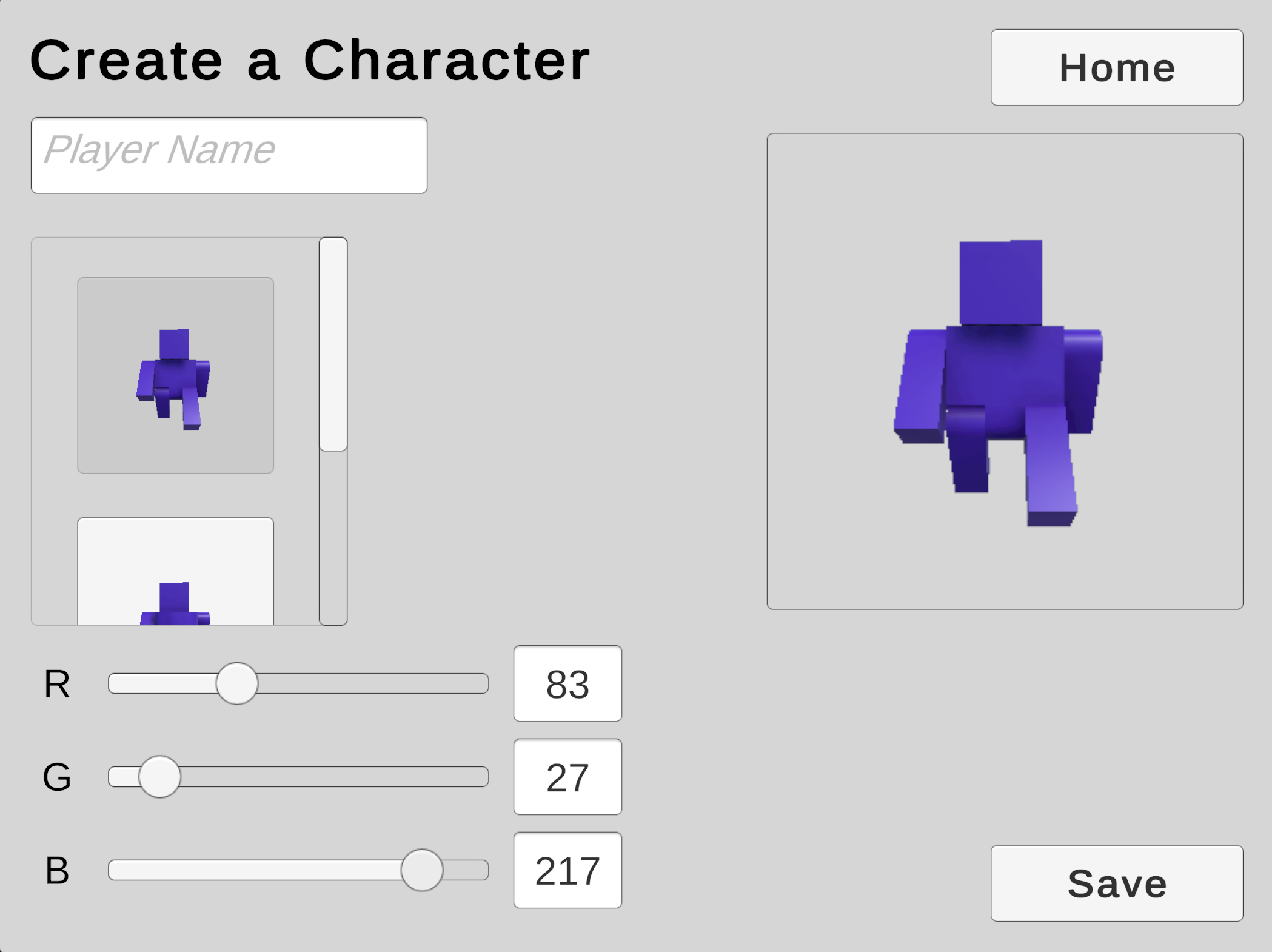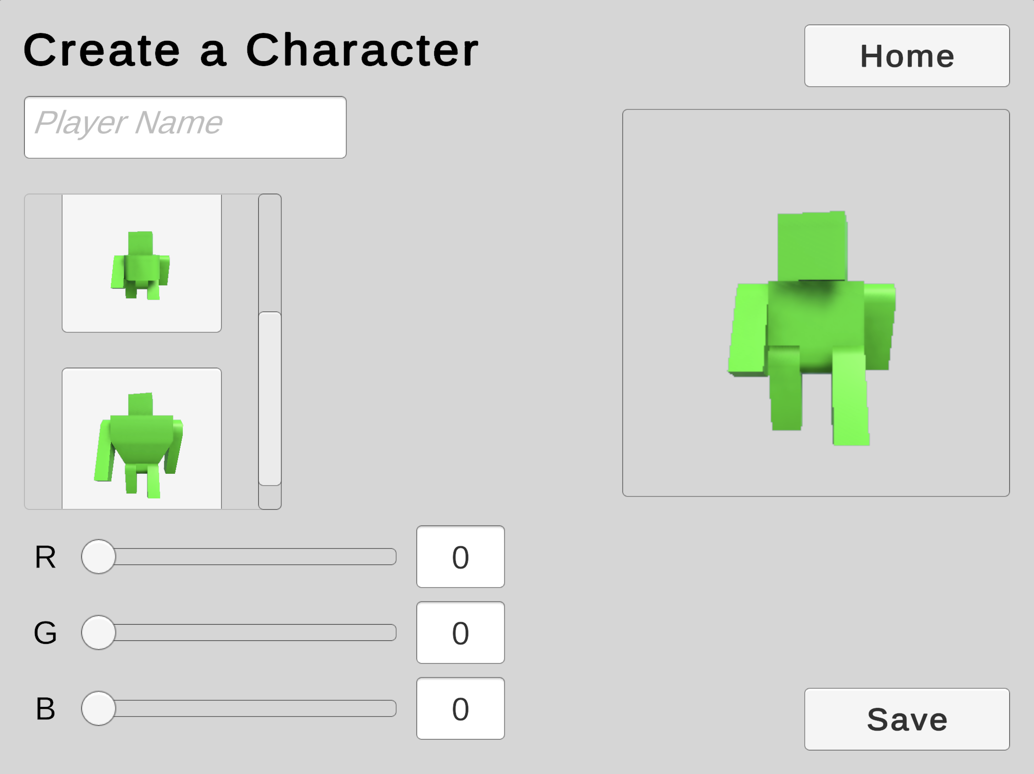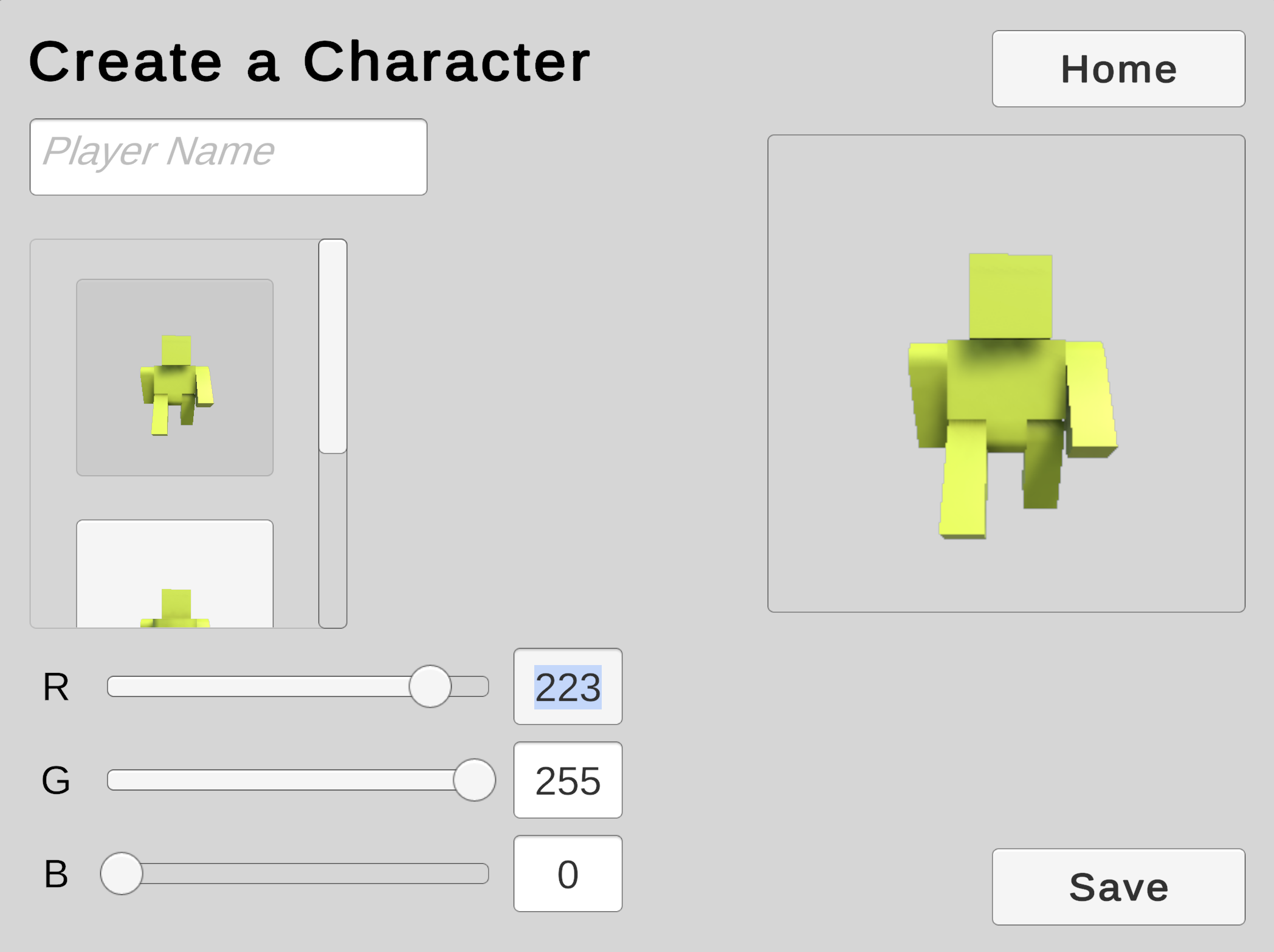 We will use a Scroll View to offer the player a choice from a collection of character models.