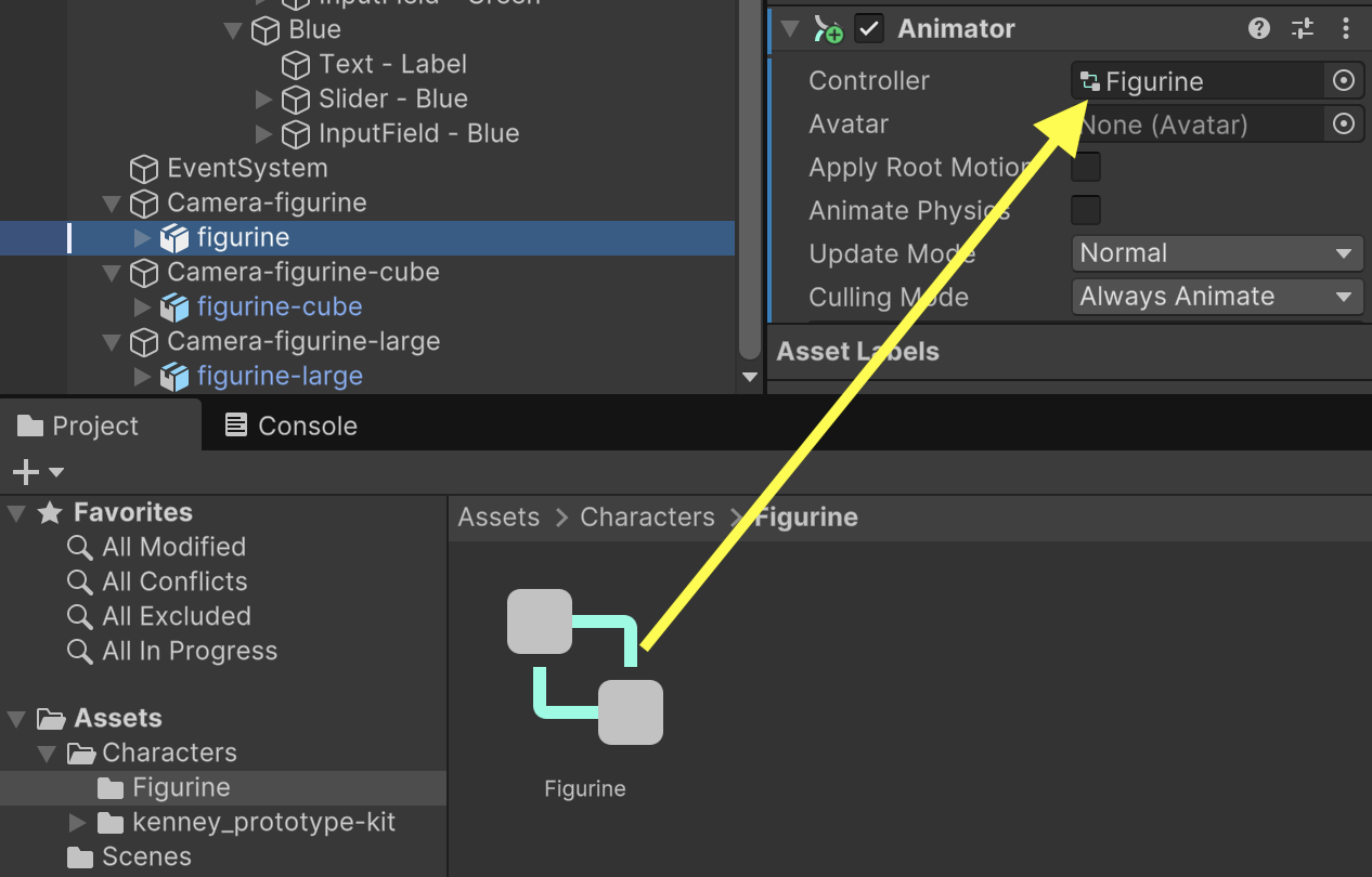 Under /Assets/Characters/ use the Project tab to create a subfolder named "Figurine" and in that subfolder create an Animation > Animator Controller asset also named "Figurine". Add an Animator component to the figurine gameObject in the Hierarchy. Use the newly created Figurine animator controller as the Animator component's Controller asset.