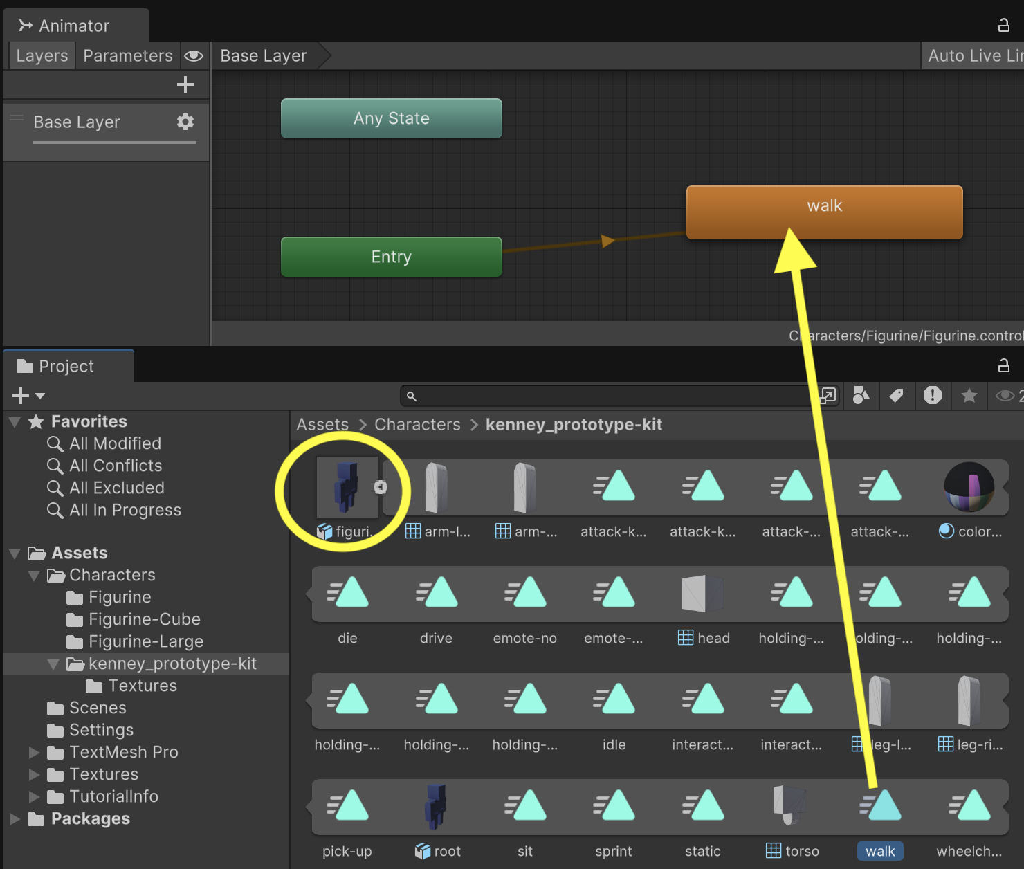 Examine the Figurine Animator Controller in the Animator tool. Expand the original "figurine" asset in the Project tab. Drag the "walk" animation bundled within the "figurine" asset into the Animator. It is important that you do NOT mix up applying animations from one model onto another model. The "figurine" model can only use the animations from "figurine". Because this is the only animation hooked up in the animator, it will play by default.
