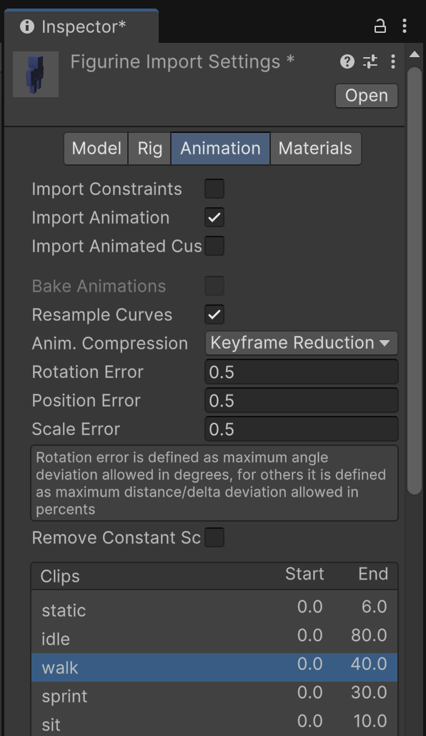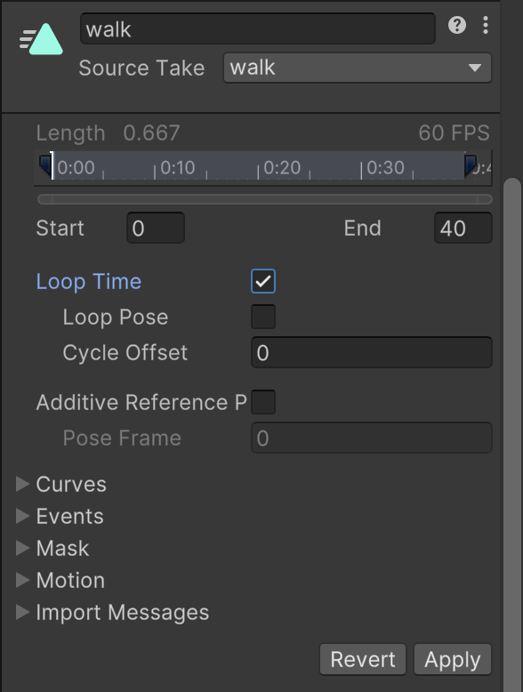 Inspect the figurine asset in the Project tab. Switch to the Animation tab in the inspector and examine the "walk" animation from the list. Scroll down to the animation details, enable "Loop Time" so that the walk cycle repeats, and click Apply