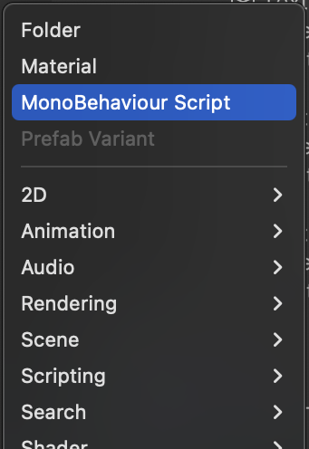 In the Project tab, add a "Scripts" subfolder within the root /Assets/ folder. Create a new C# script (now called "MonoBehaviour Script" in the newer versions of Unity) and name the file MenuCharacterCreator.
