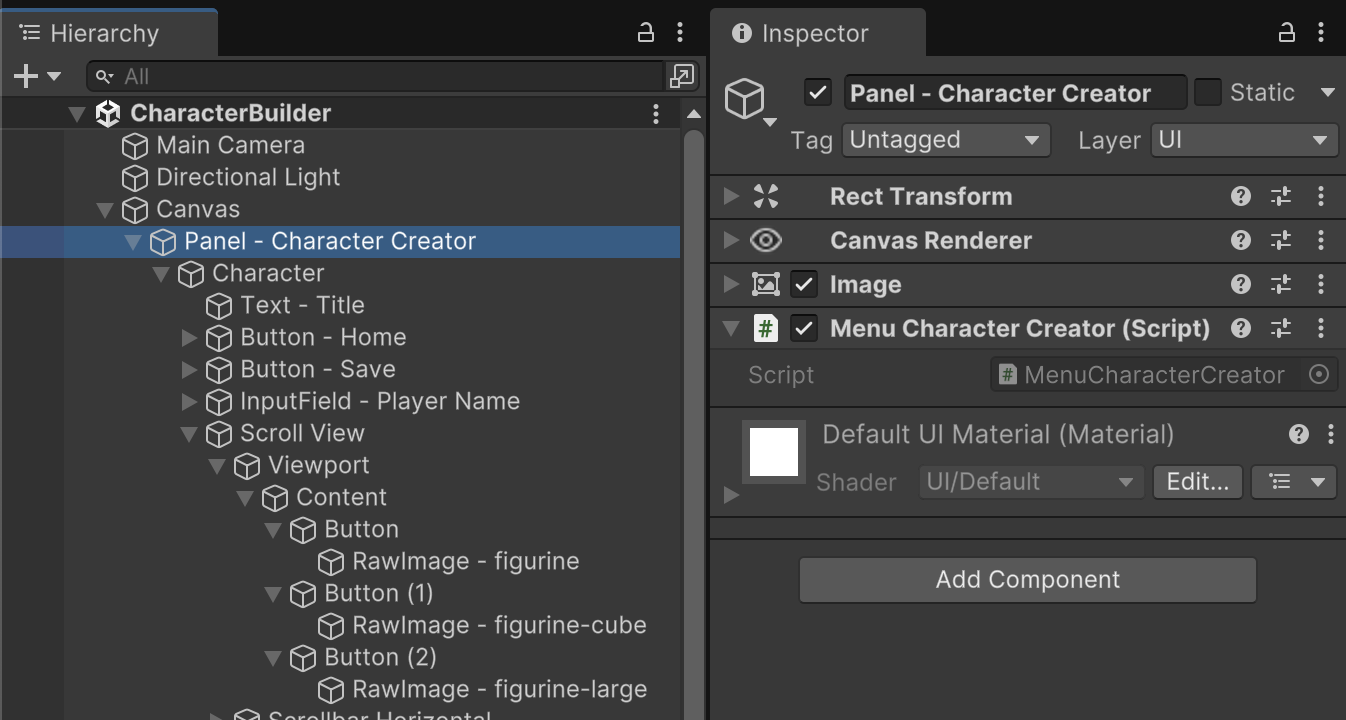 Attach the MenuCharacterCreator component to the "Panel - Character Creator" gameObject.