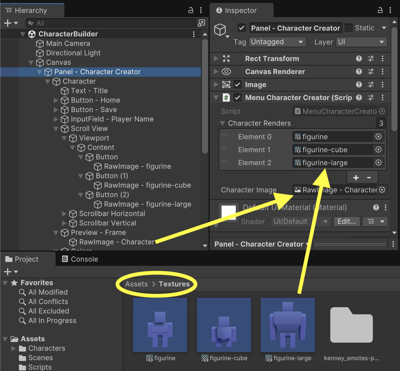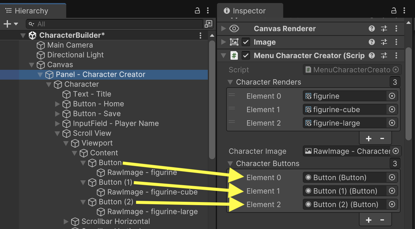 Fill in the outlets for the MenuCharacterCreator component. The three CharacterRenders are the Render Textures in the Project tab. They must be added in the same order as the buttons. (Button0 is figurine, while Button1 is figurine-cube, and Button2 is figurine-large.) The Character Image outlet references the "RawImage - Character" gameObject already in the Hierarchy tab.