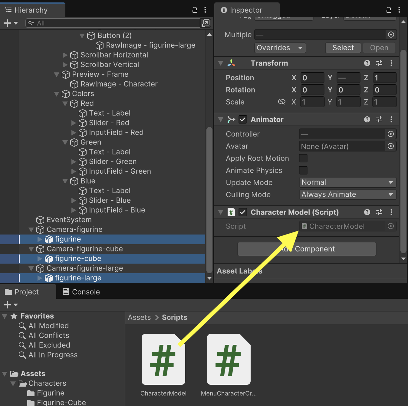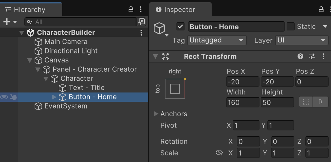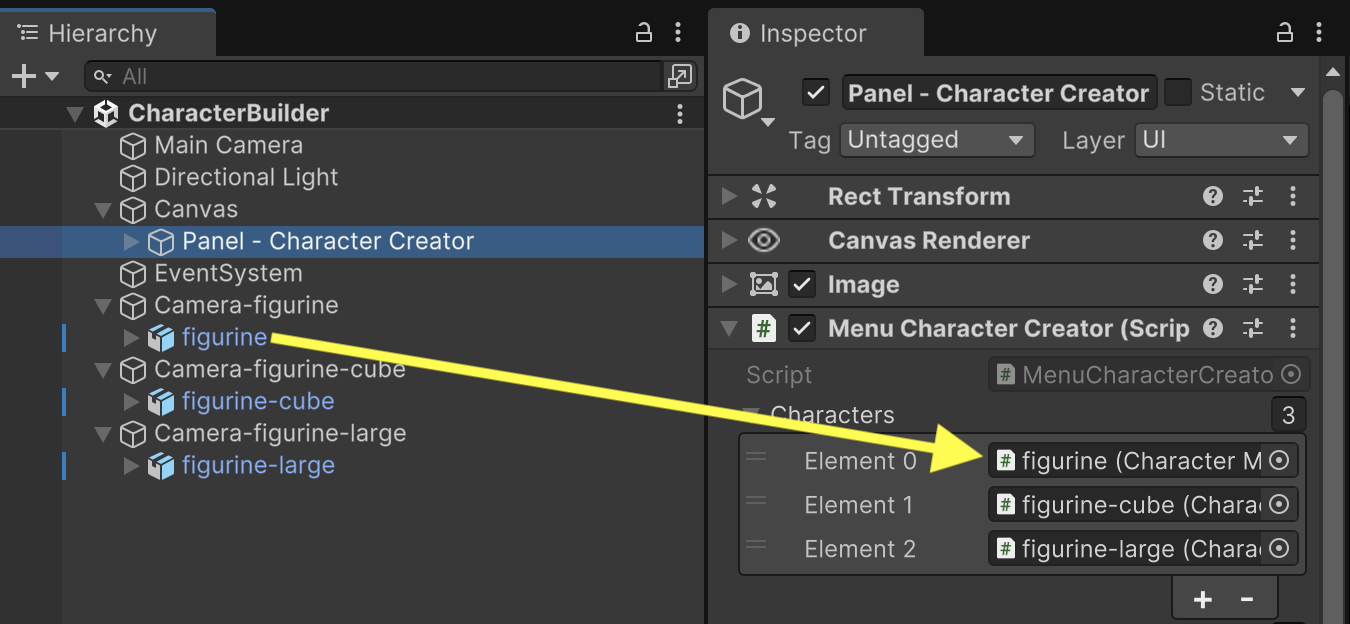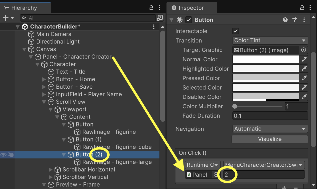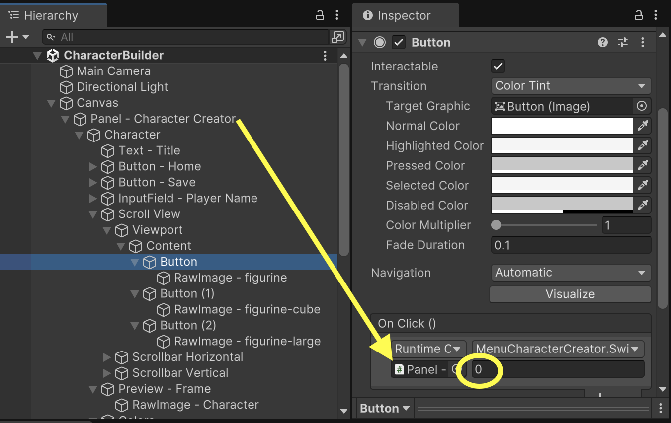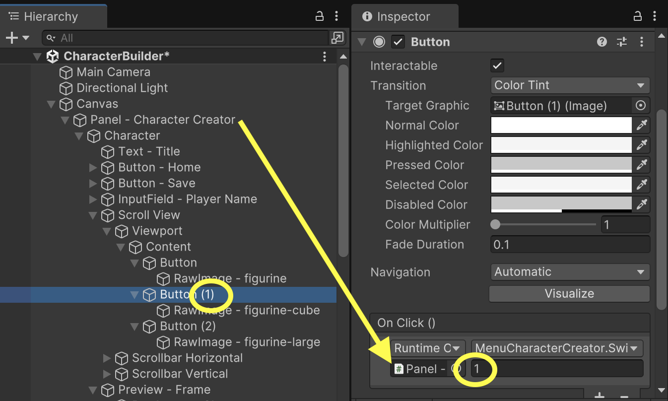 Each of the character Buttons will have a click event that triggers the SwitchCharacter() function available on "Panel - Character Creator". Each button should pass in the index representing its matching character model. (Button0 is index 0 for figurine, Button1 is index 1 for figurine-cube, and Button2 is index 2 for figurine-large.)
