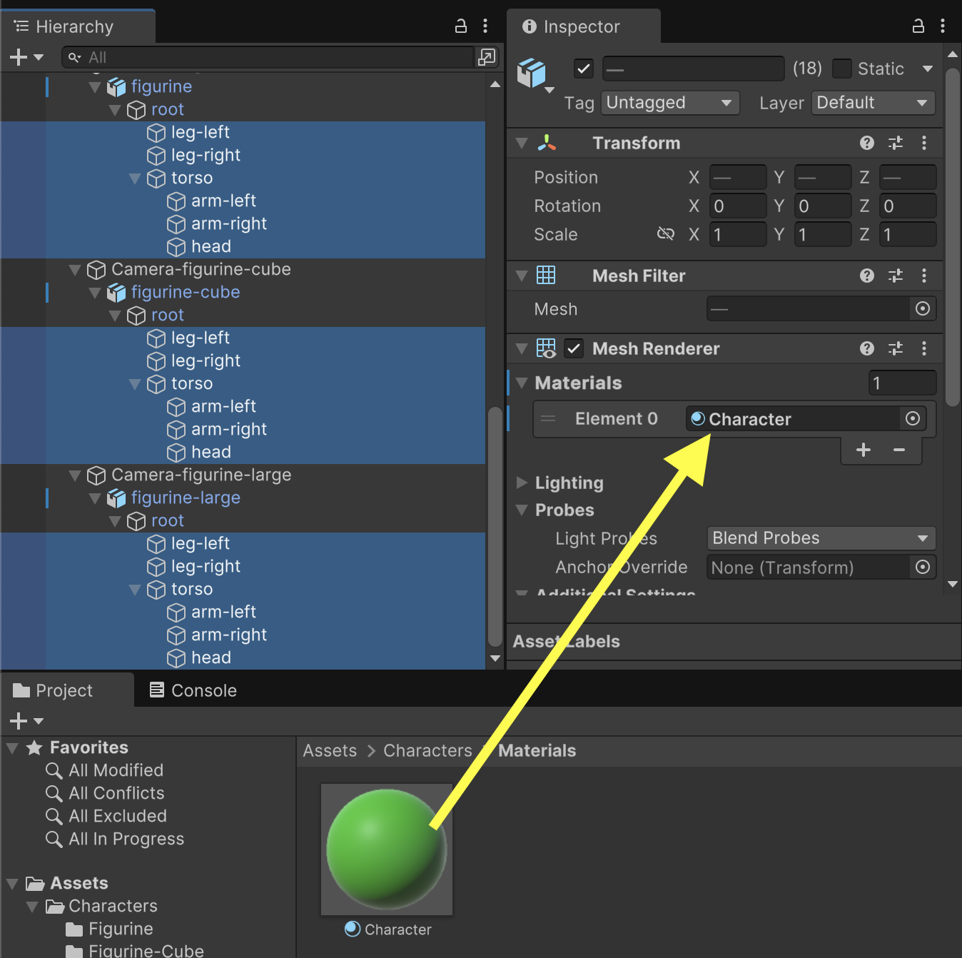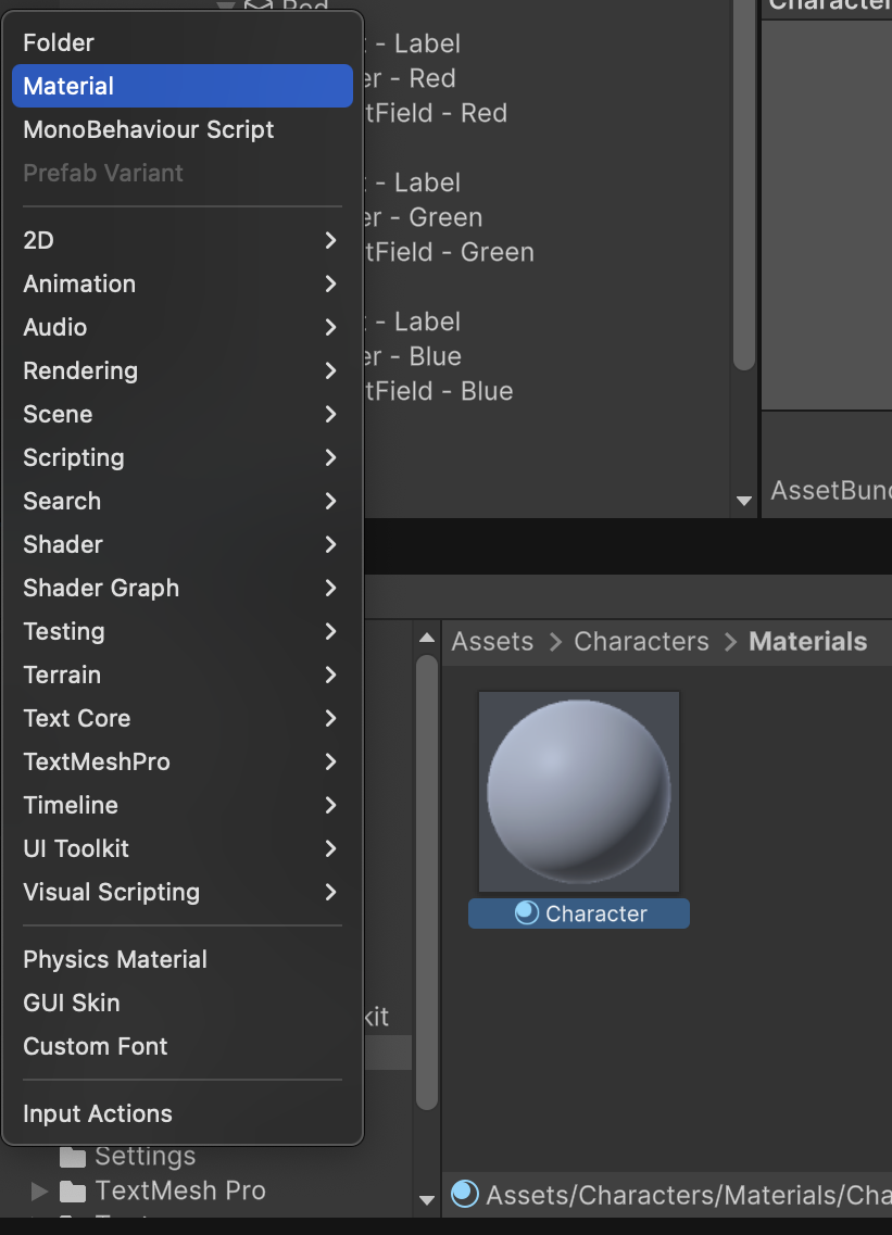 In the Project tab, create a "Materials" subfolder under /Assets/Characters/ and in that subfolder, create a Material named Character.