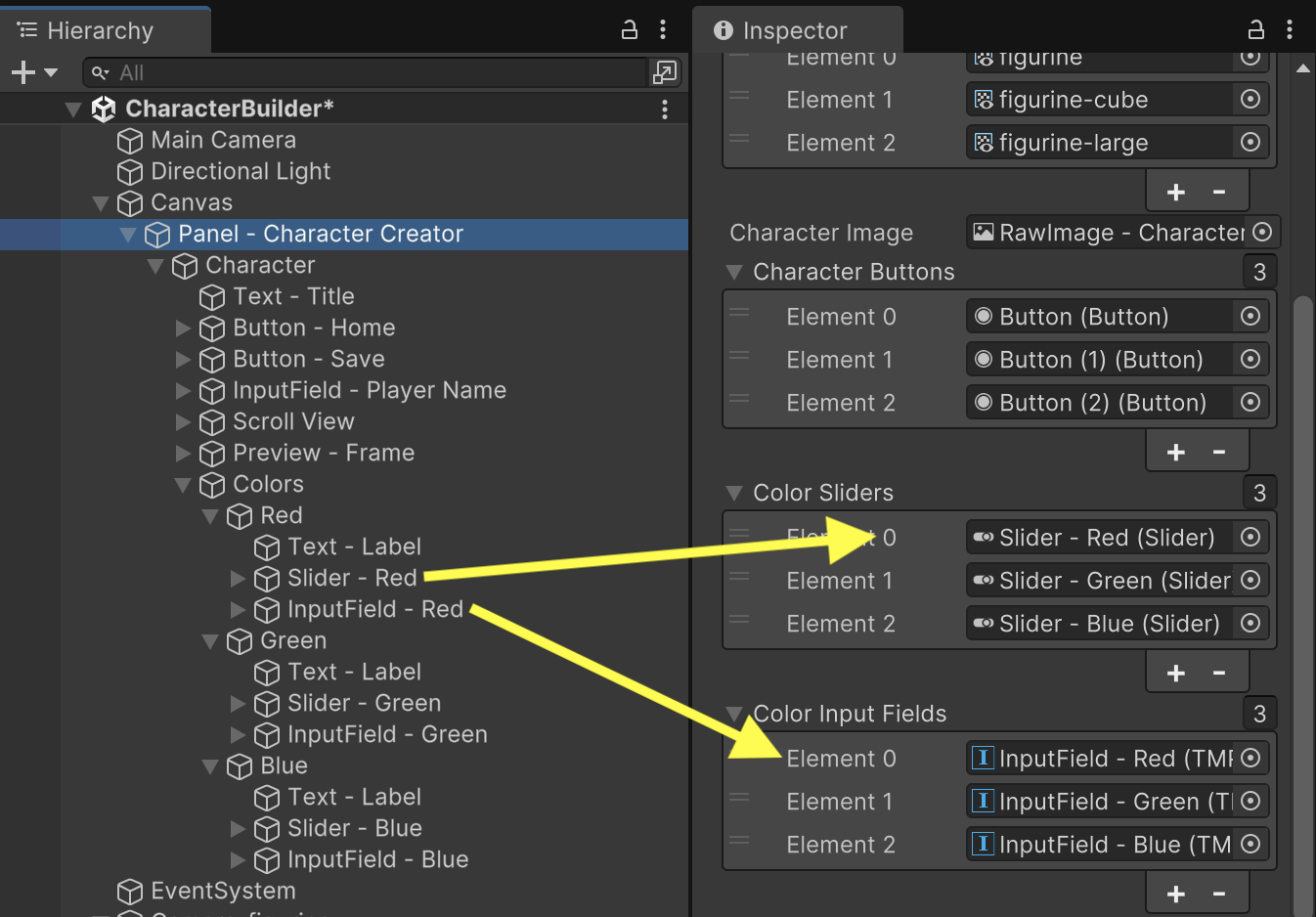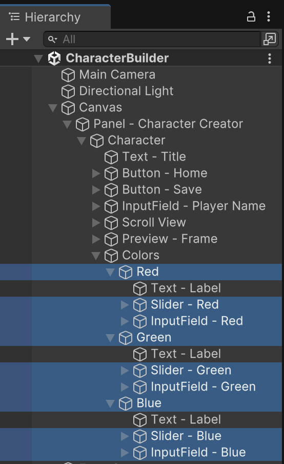 To help keep track of our color choices, we will add a state tracking variable to MenuCharacterCreator. (Keep in mind this line of code is temporary, and we will rearrange some of this logic in a future assignment when we implement save data. We will also add references to our various UI sliders and input fields to display current color measurements.