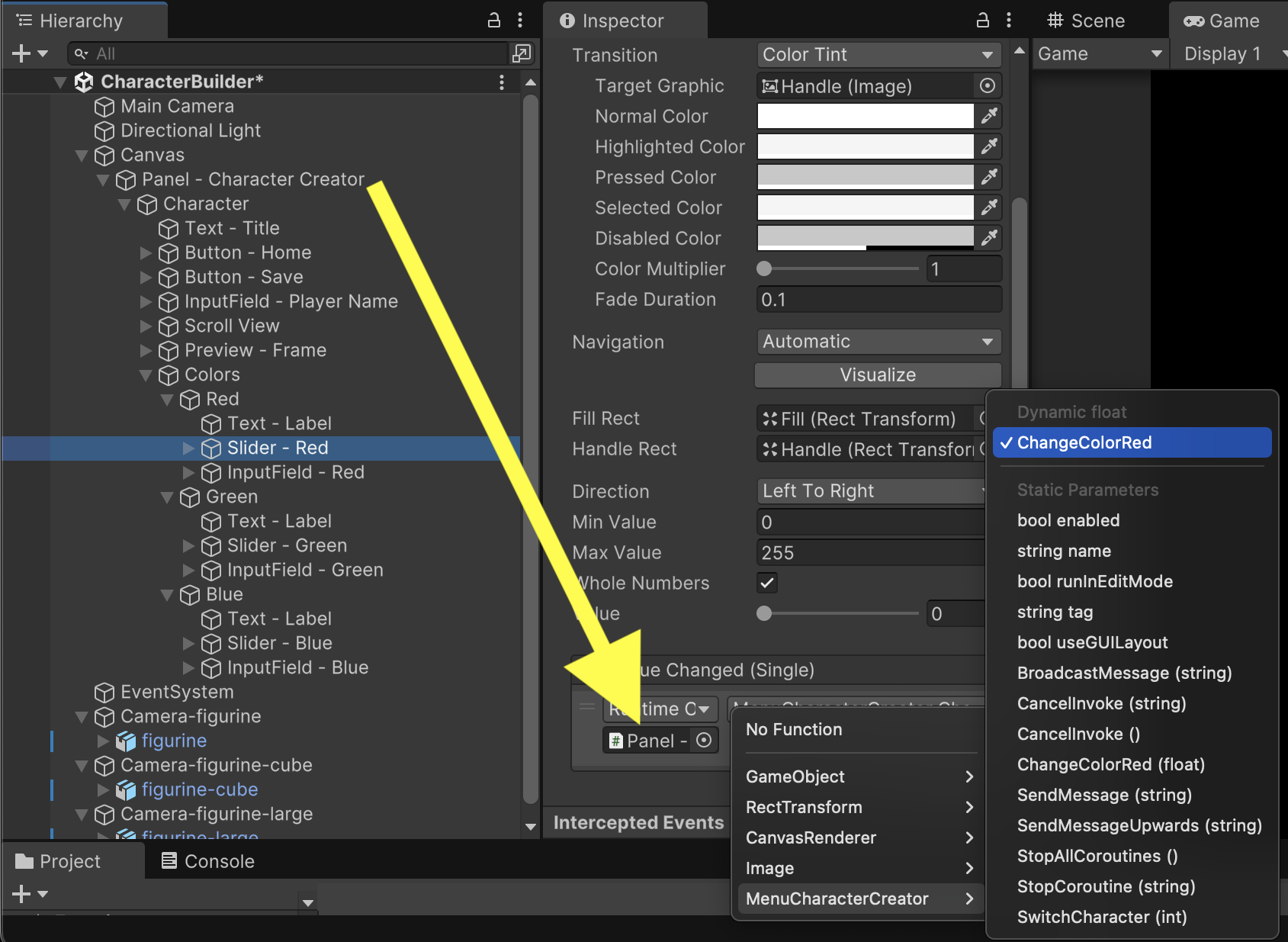 Fill in the new Slider and Input Field properties following an order in which index 0 is Red, index 1 is Green, and index 2 is Blue.