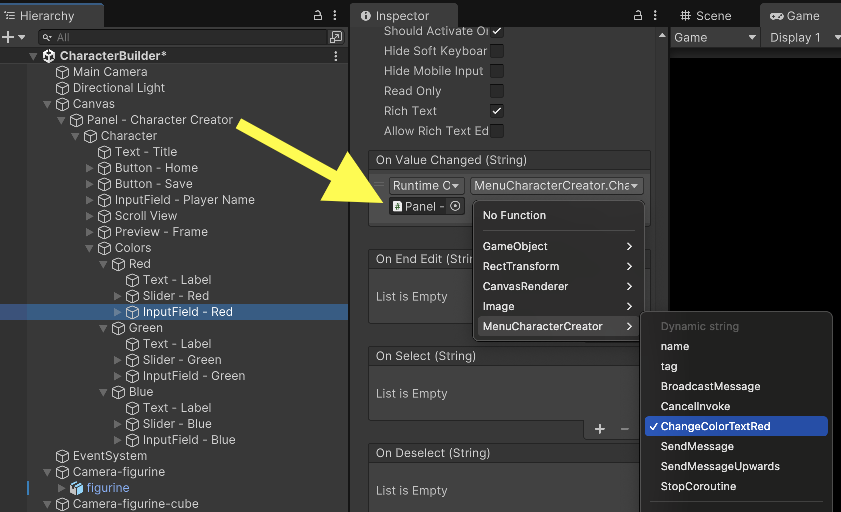 Similar to Slider, our Red InputField will use ChangeColorTextRed for its OnValueChanged event.