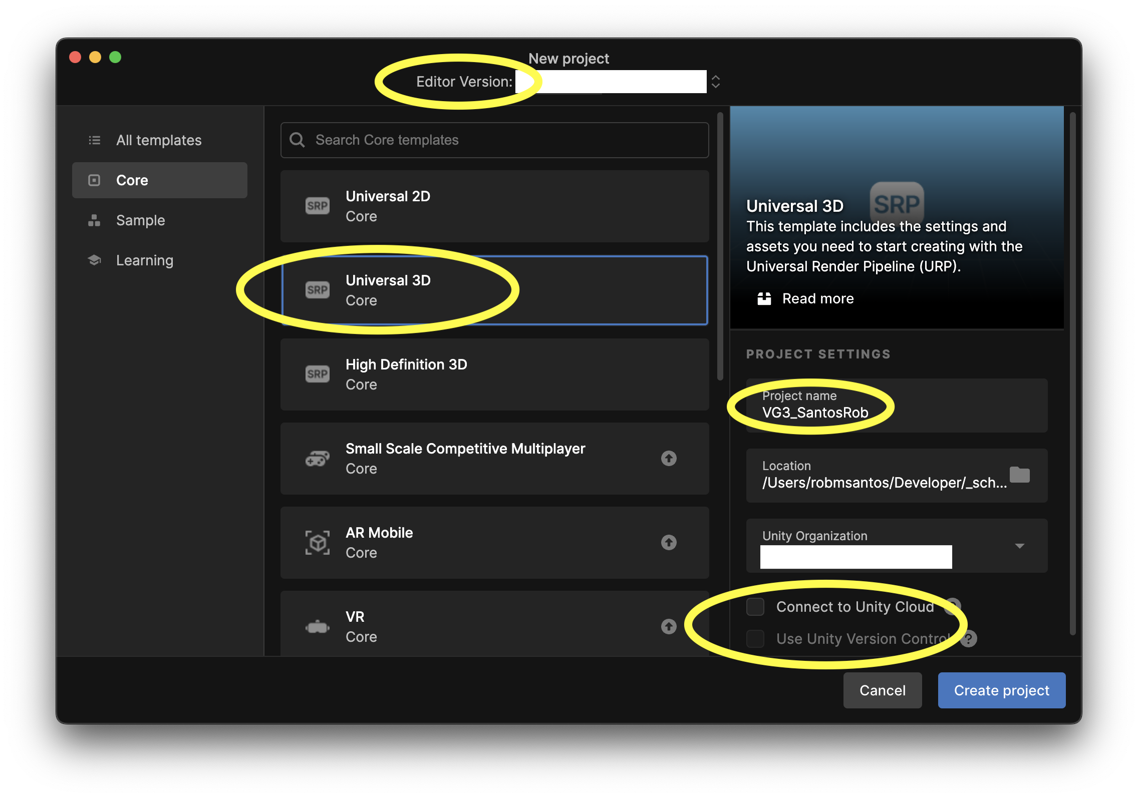 Unity provides different templates for starting your project. All of the projects we do this semester will be "Universal 3D" SRP template games.