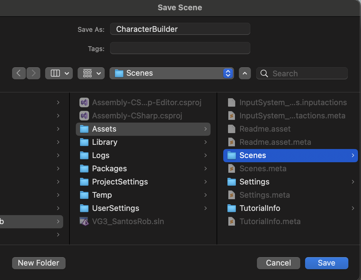 Use the File > Save menu and name your new scene as "CharacterBuilder" which will be saved in the project /Assets/Scenes/ folder.